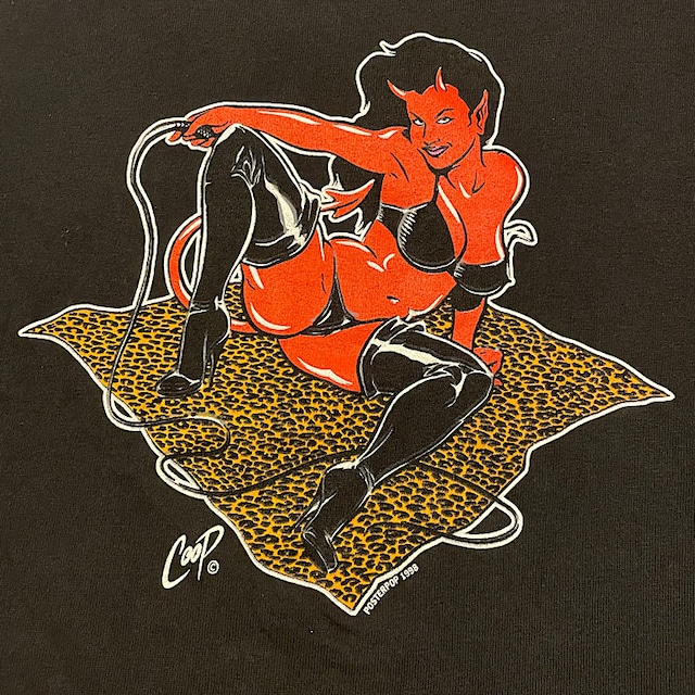 90s POSTER POP ポスターポップ COOP レッドデビル ビンテージ Tシャツ USA製 1998 HOT ROD ローブロー ホットロッド TATTOO ハーレーダビッドソン ヘビーコットン(黒,Mサイズ)袖裾ダブルステッチ ローブローアート界の巨匠クープのTシャツです。 SIZE:Mサイズ(肩幅約48cm,身幅約50cm,着丈約68cm,袖丈約20cm) COLOR:黒 CONDITION:USED。右前裾あたりに目立たない軽い汚れがあります。プリントの状態も良く生地も肉厚、そこまで着こまれていない状態ですので美品レベル。