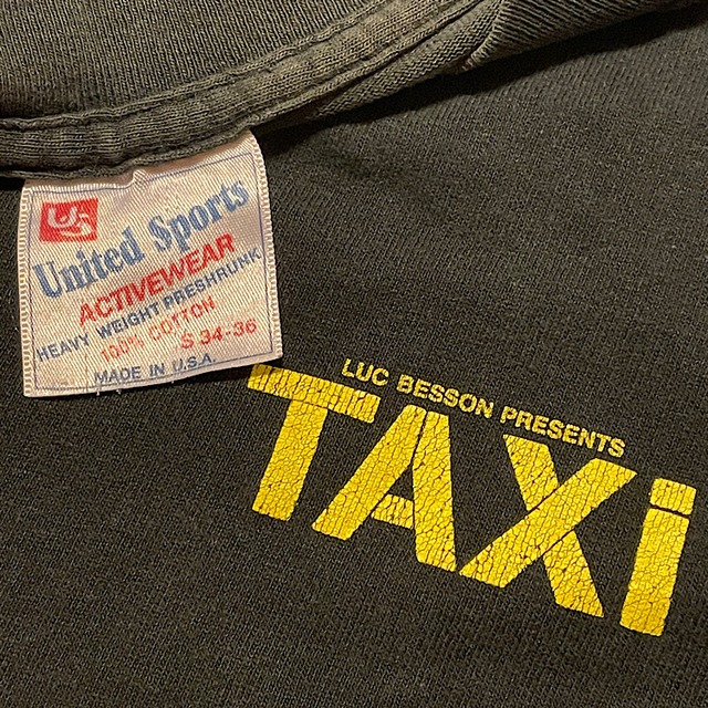 90s United Sports 映画タクシー TAXI ムービーT プロモT 両面プリント ビンテージ Tシャツ USA製(黒,Sサイズ)袖裾シングルステッチ LUC BESSON PRESENTS リュックベッソン作品、映画タクシー TAXI プロモTです。 SIZE:Sサイズ表記 Mサイズ程度(肩幅約42.5cm,身幅約46.5cm,着丈約59cm,袖丈約20cm) COLOR:黒 CONDITION:USED。ヘビーコットン。色気のあるサンフェードが嬉しいポイント。特に目立つ汚れのない状態。 USEDに理解のある方、お越しください。