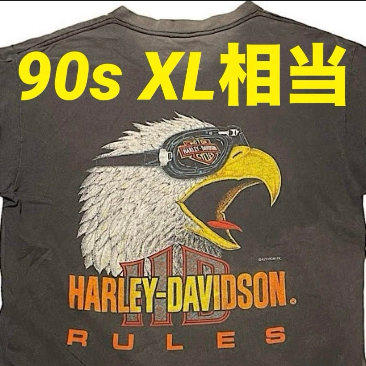 90s ビンテージ ハーレーダビッドソン Tシャツ USA製 ポケT 胸ポケット付き HDオフィシャル ゴーグルイーグル(黒,Lサイズ)袖シングル裾ダブルステッチ