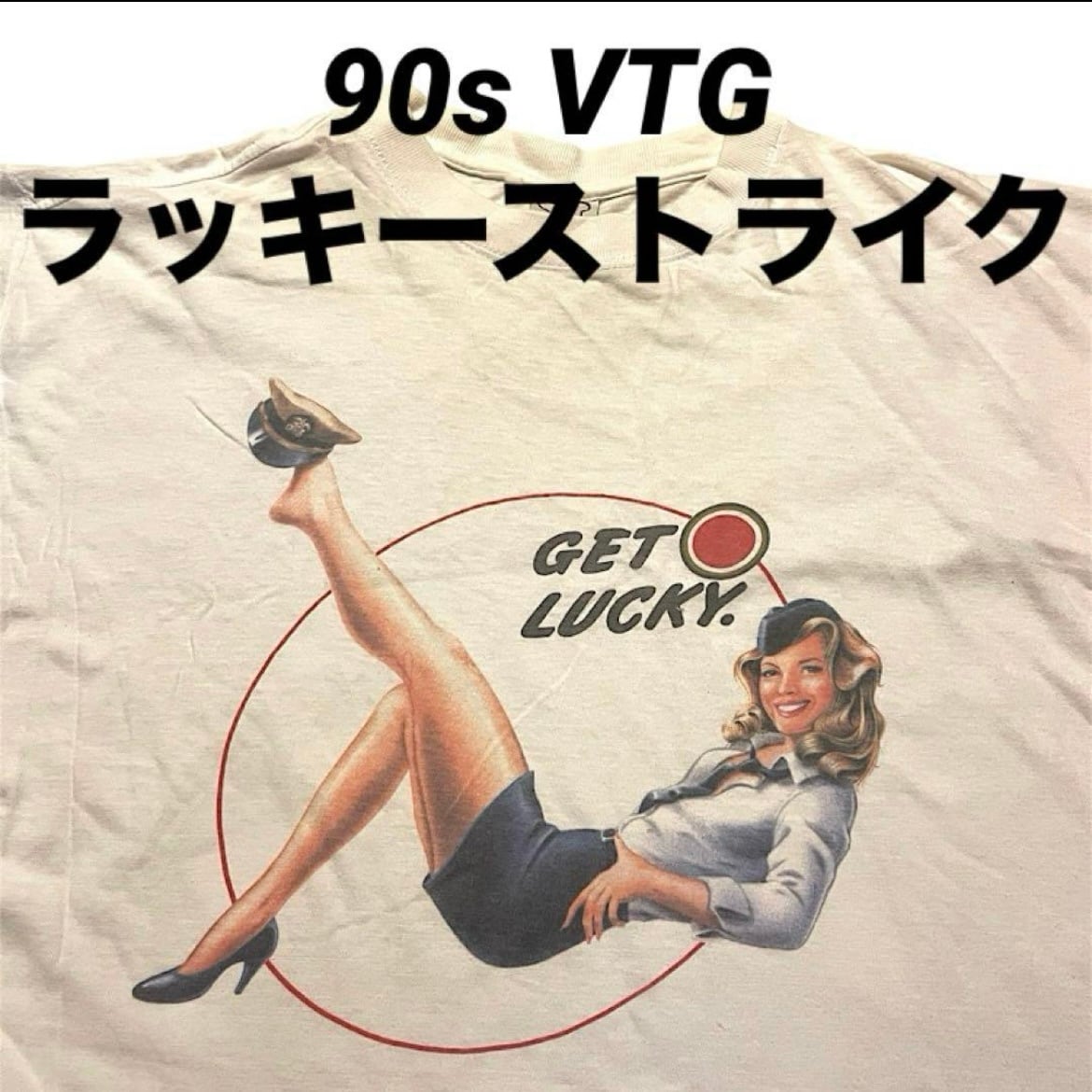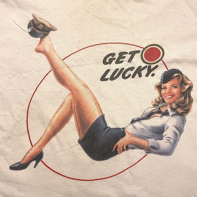 キャッチコピー『GET LUCKY』の文字とCAのピンナップガールがプリントされたキャッチーな1枚。