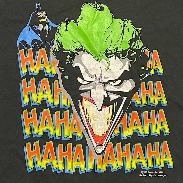 たまに見かける銃とトランプを持っているジョーカーのHAHAHAプリントではなく、バットマンもプリントされた激レアパターンです。