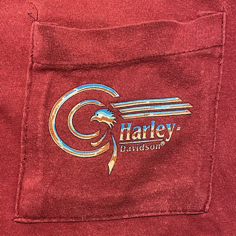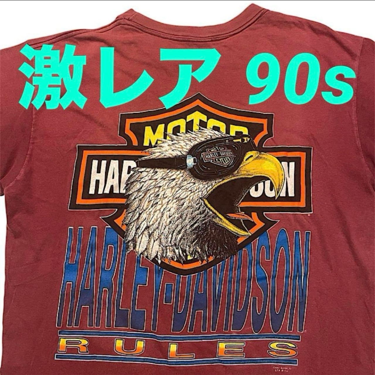 90s ビンテージ ハーレーダビッドソン Tシャツ USA製 ポケT 胸ポケット付き HDオフィシャル ゴーグルイーグル(エンジ,Lサイズ)袖裾シングルステッチ