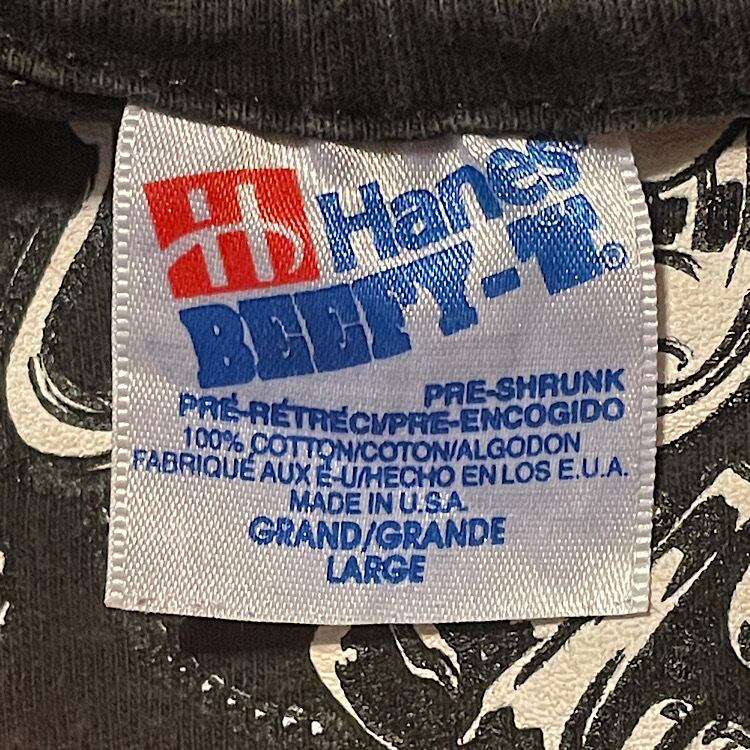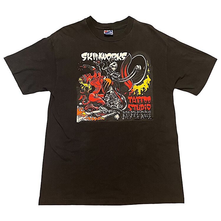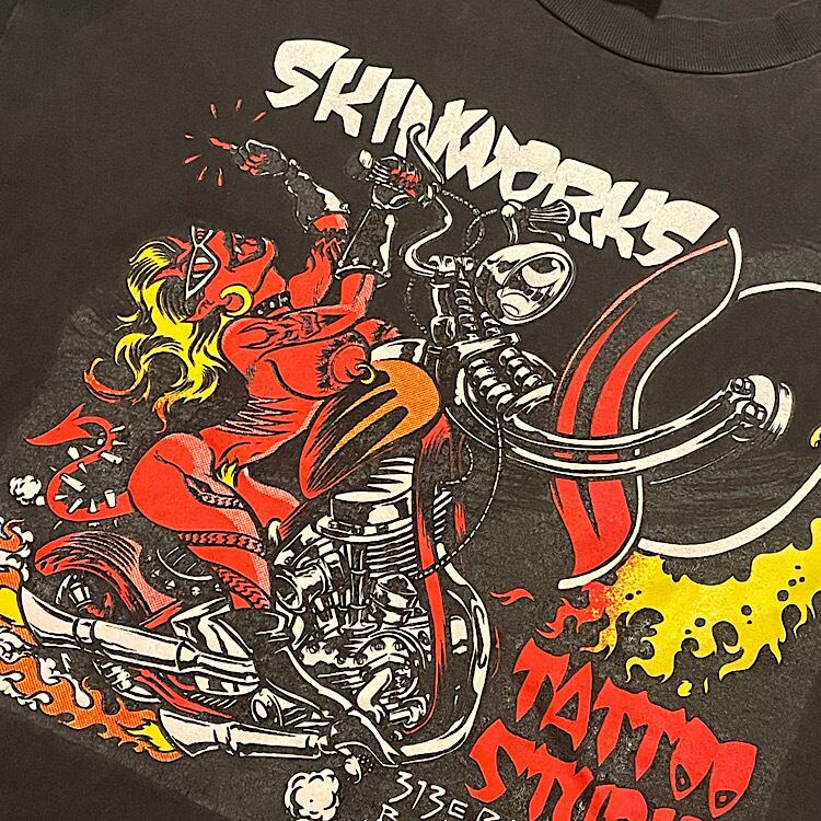 激レア当時物 90s Hanes BEEFY-T SKINWORKS TATTOO STUDIO ビンテージ タトゥーショップ Tシャツ ハーレーダビッドソン レッドデビル ヌードレディー エロプリ USA製 ヘビーコットン(黒,Lサイズ)袖裾シングルステッチ