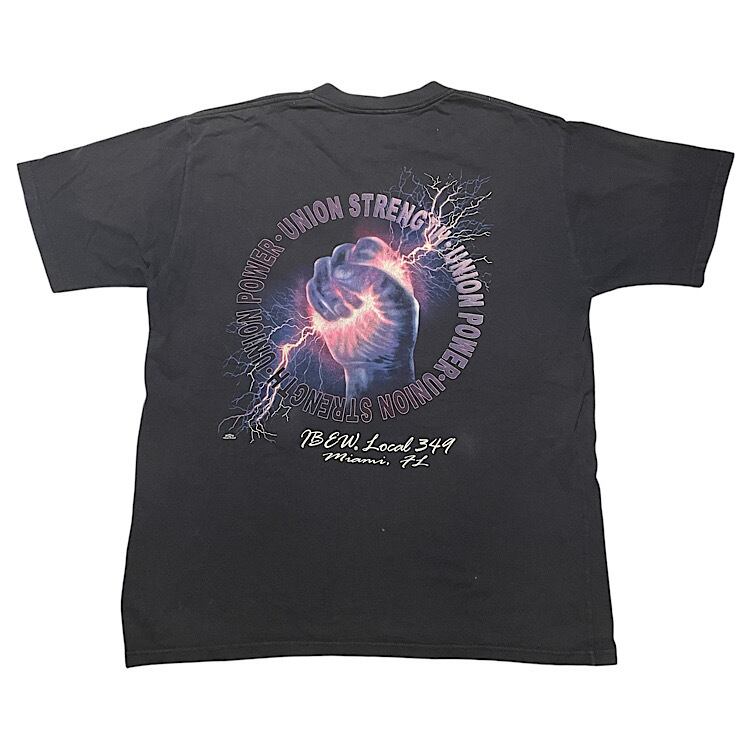 激レア 90s 00s UNION POWER 雷サンダーデザイン ビンテージ ポケT Tシャツ 両面プリント USA製 ヘビーコットン(ナス紺ネイビー,XLサイズ程度) 袖裾ダブルステッチ