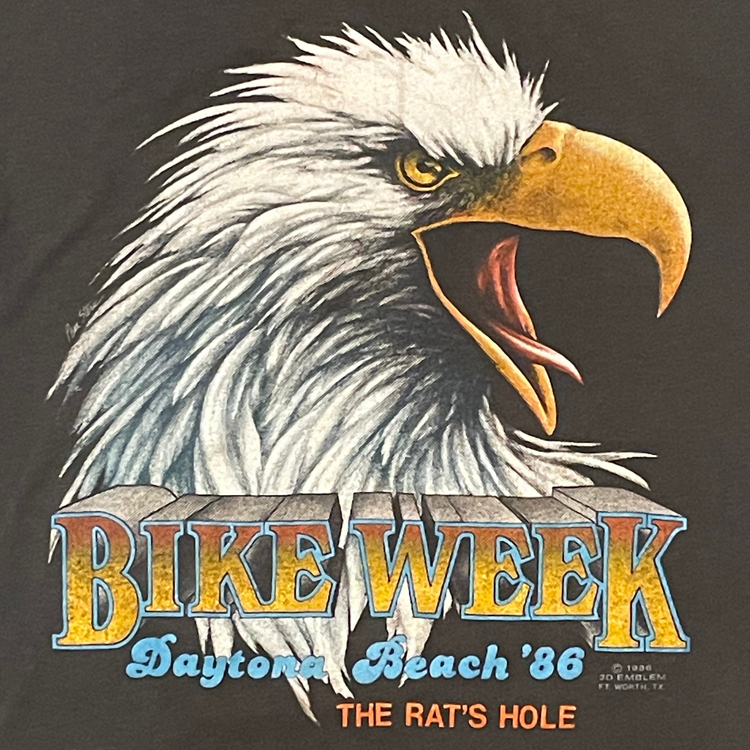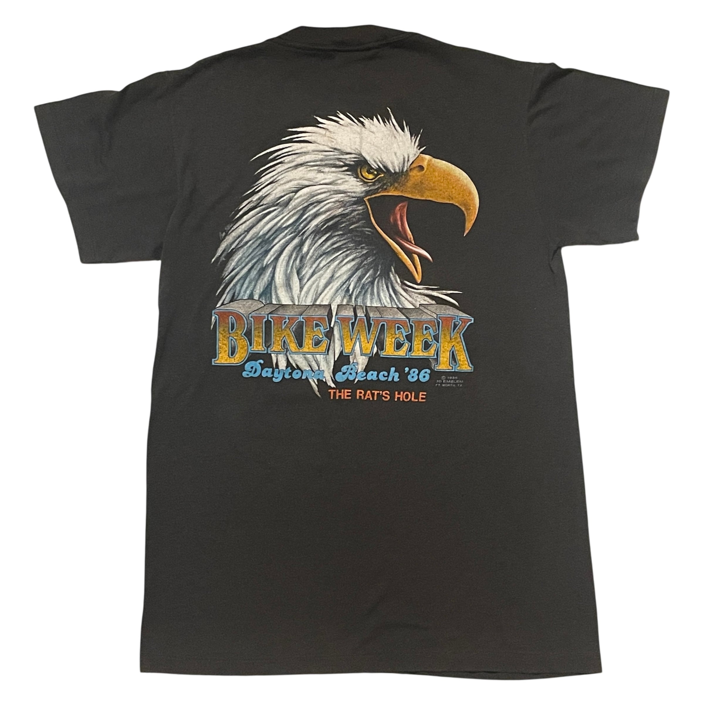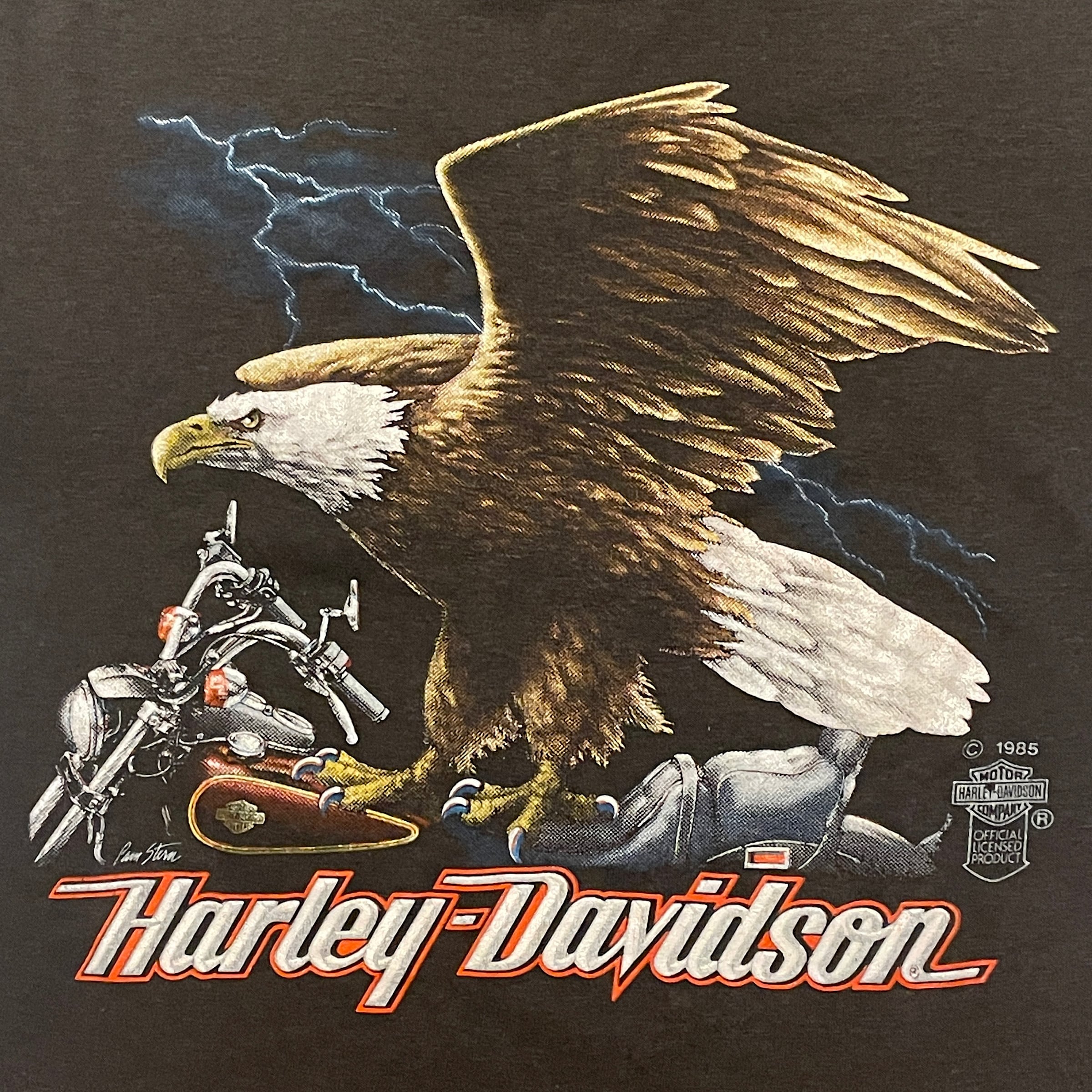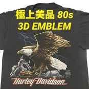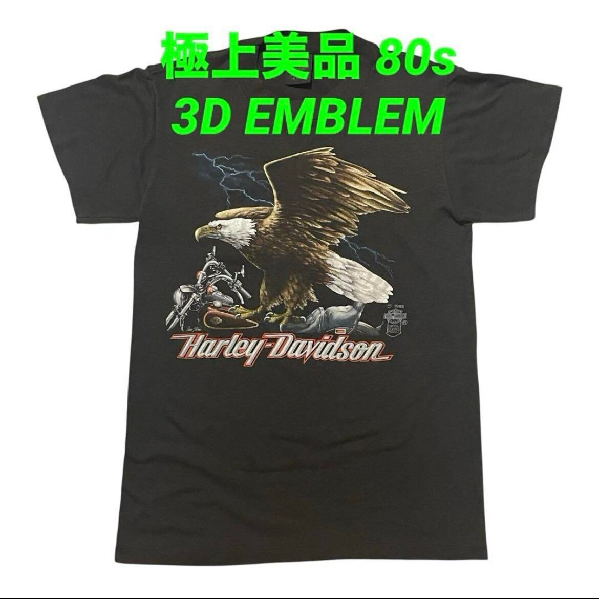 極上美品 激レア 80s 3D EMBLEM ハーレーダビッドソン ビンテージ Tシャツ フロント©️1985 バック©️1986 イーグル×サンダー RAT'S HOLE 両面プリント(黒,Mサイズ)袖裾シングルステッチ