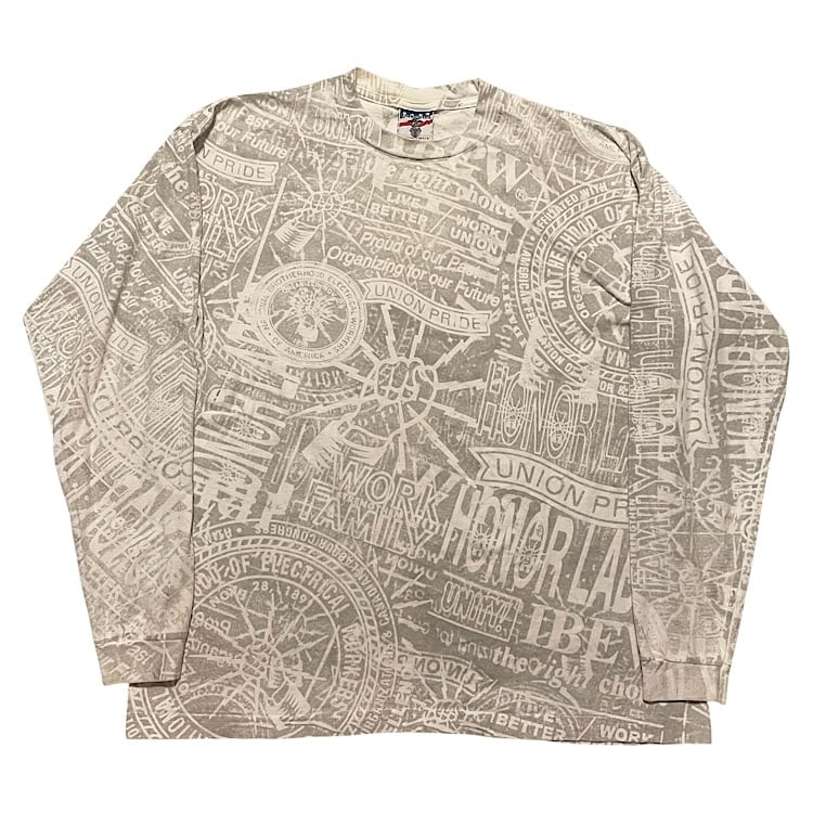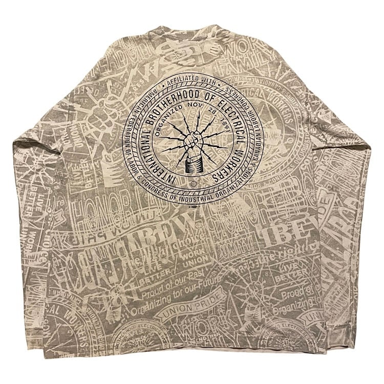激レア 90s 雷サンダーデザイン ビンテージ ユニオンメイド 両面総柄 ロンT Tシャツ USA製 UNION MADE Allover INTERNATIONAL BROTHERHOOD OF ELECTRICAL WORKERS ヘビーコットン(国際電気労働者友愛会)(白,XLサイズ)
