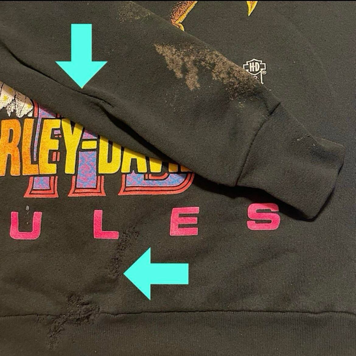 生地は数回着用ぐらいで毛玉も一切なくしっかりした状態です。プリントロスも一切なく、使用には問題のない古着です。