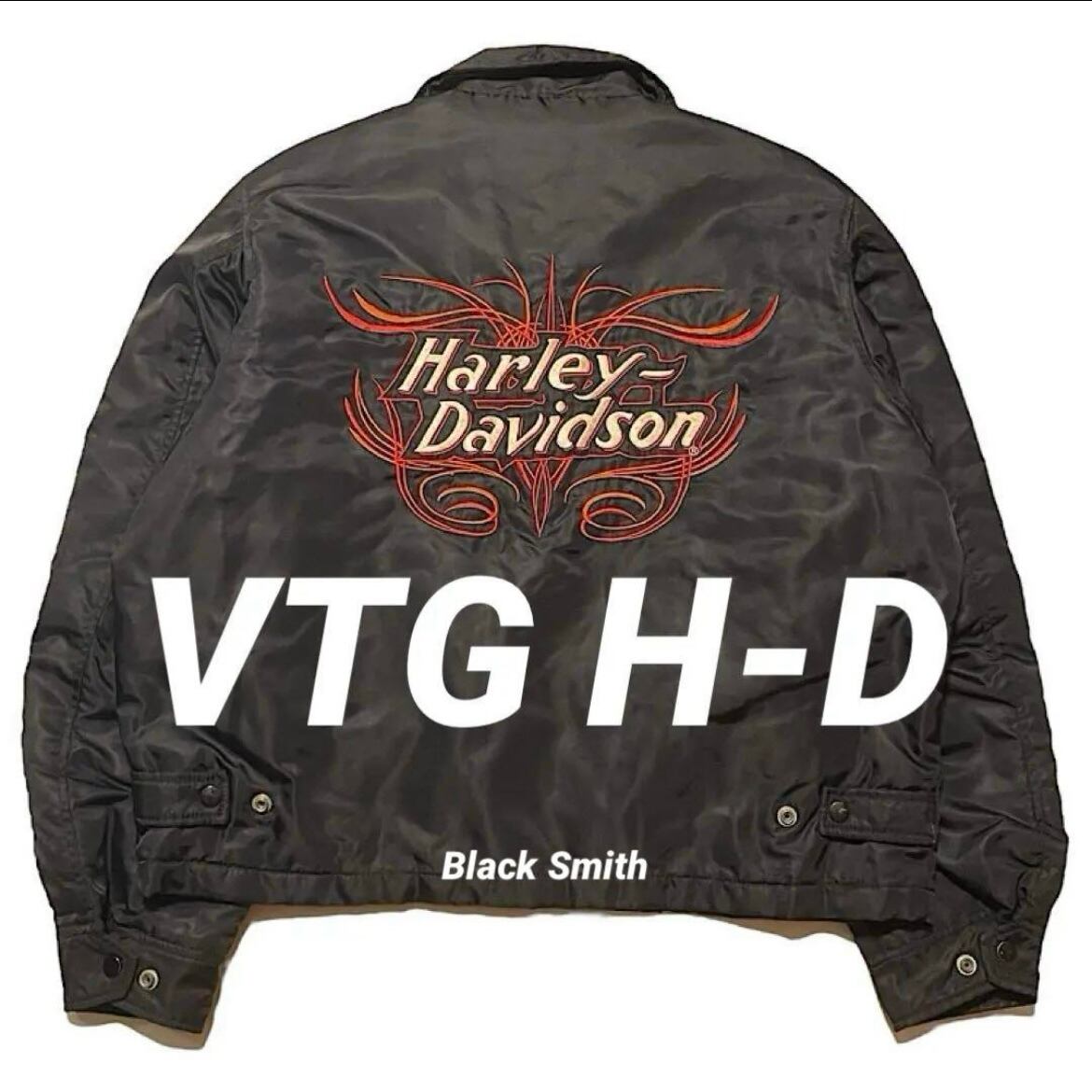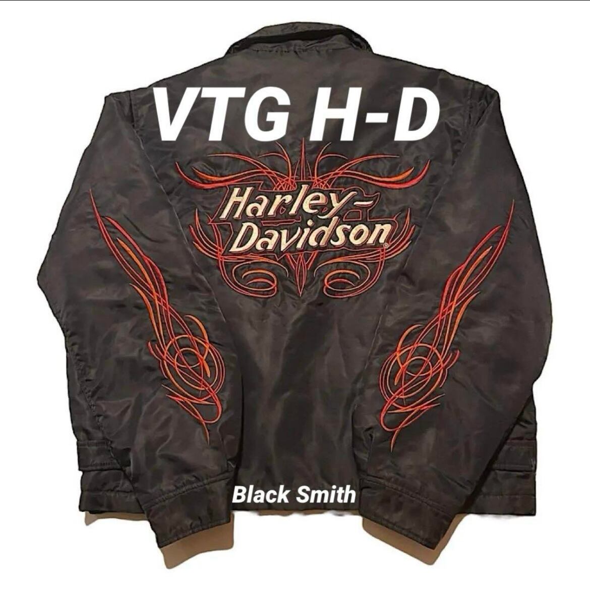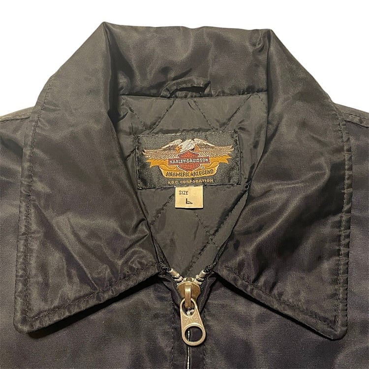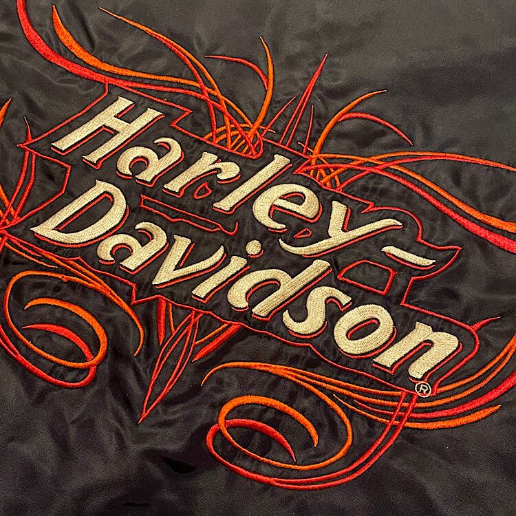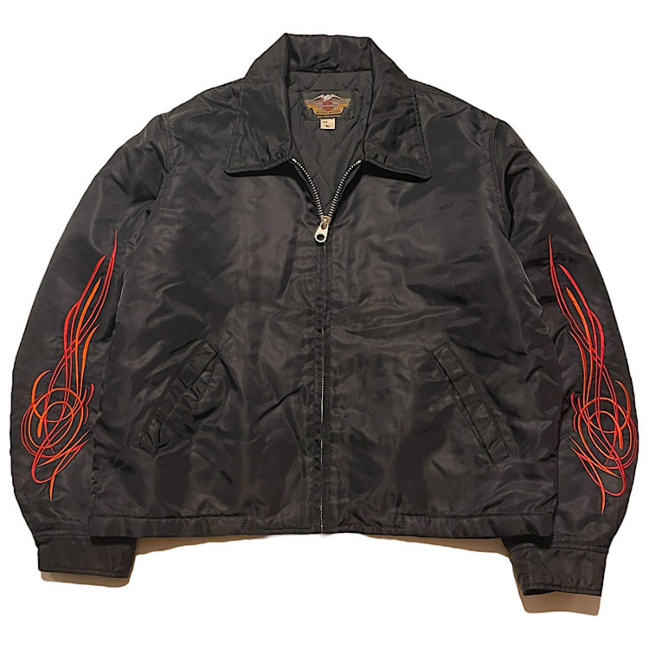 ハーレーダビッドソン ビンテージ ナイロンジャケット 袖フレイム 背面袖刺繍モデル オフィシャル 短丈中綿入り Harley Davidson スタジャン ピンストライプ(黒,Lサイズ)