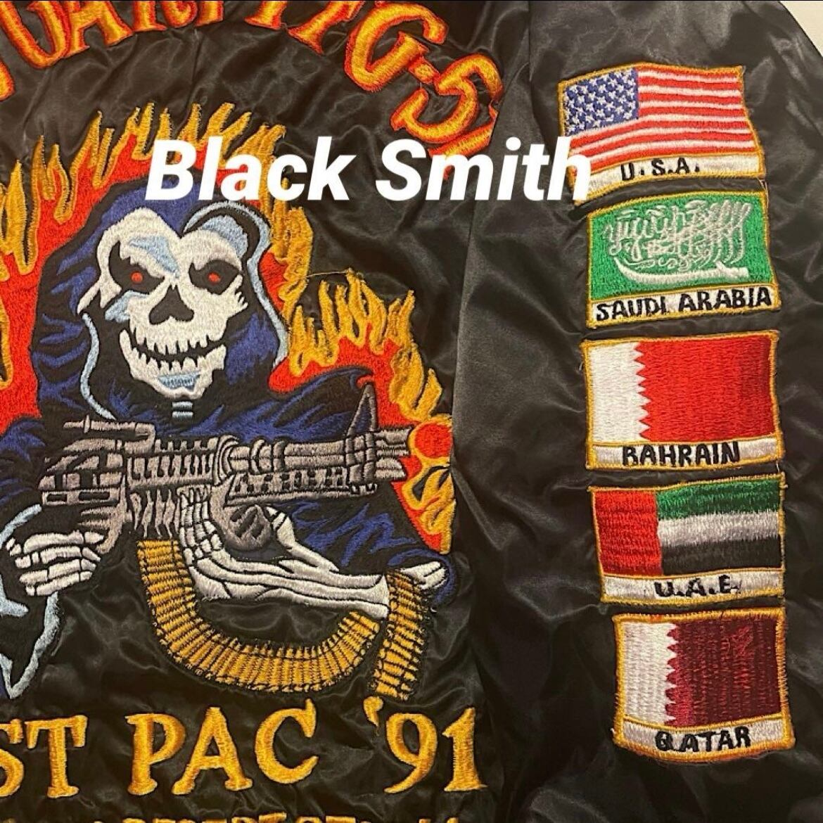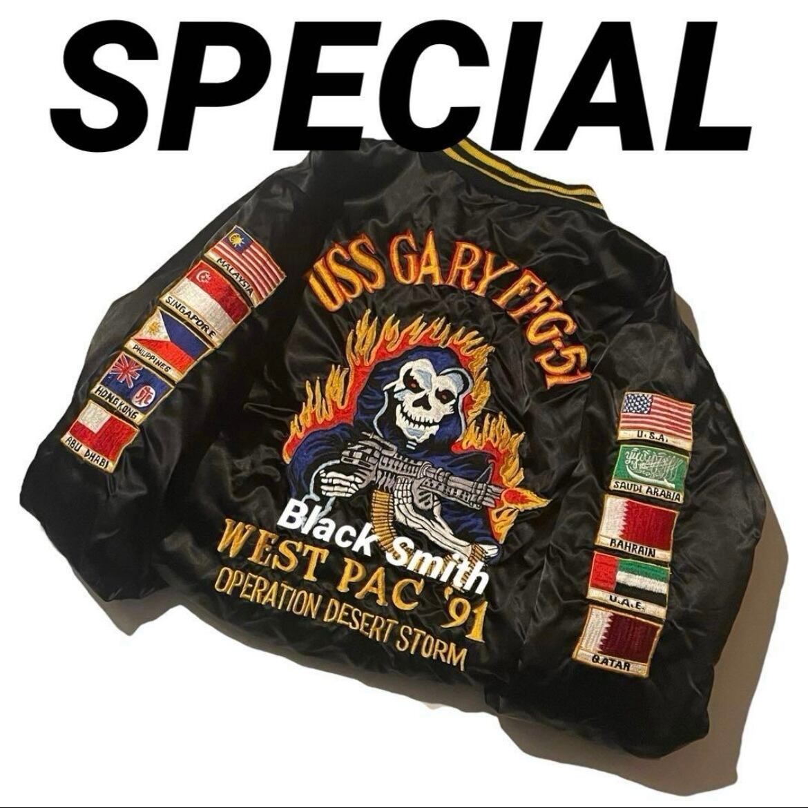 激レア フルパッチ 90s ビンテージ ツアージャケット 死神スカル刺繍 スカジャン アメリカ海軍 ミリタリー 中綿キルティング ナイロンサテン USS GARY FFG-51 WEST PAC 1991 湾岸戦争 OPERATION DESERT STORM USN USMC(黒,XLサイズ程度)