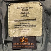 アメリカ軍関係に制式納入しているアルファ社(ALPHA INDUSTRIES)だけあって、安定したクオリティーのMA-1の後継モデルにあたるCWU-45Pフライトジャケット