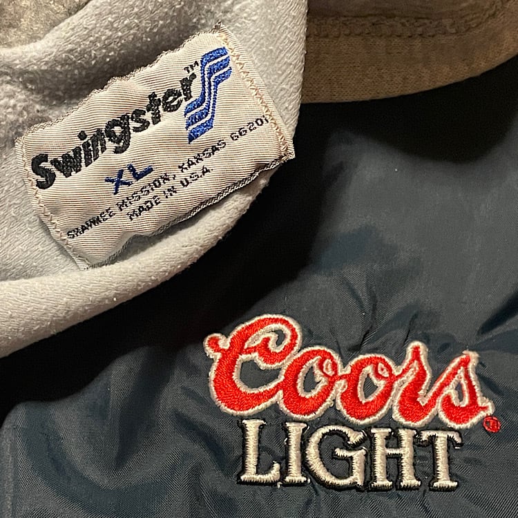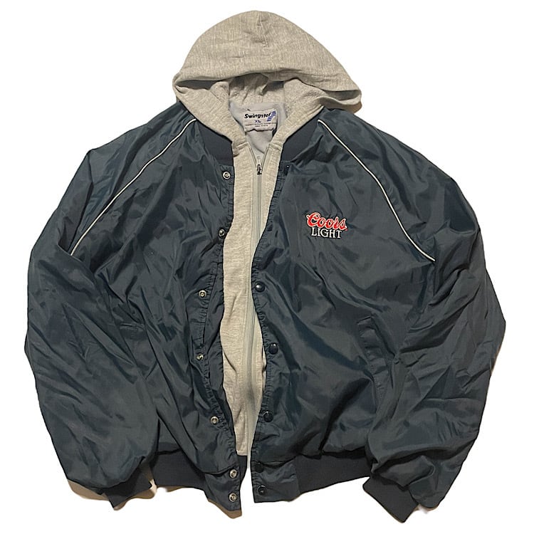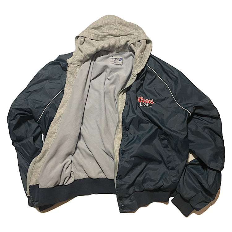 激レア 80s Coors Racing swingster Coors LIGHT クアーズレーシング ビール刺繍 ナイロン コーチジャケット×パーカー スウェット ジップアップ USA製 短丈 ラグランスリーブ(濃紺 ダークネイビー,XLサイズ)