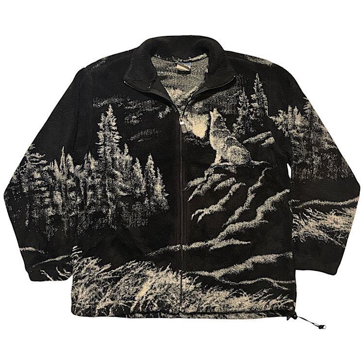 90s 狼ウルフ アニマルプリント ビンテージ フリースジャケット Art Unlimited(黒,Lサイズ程度)