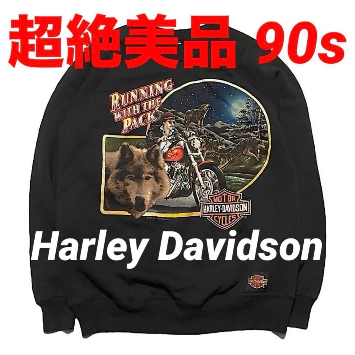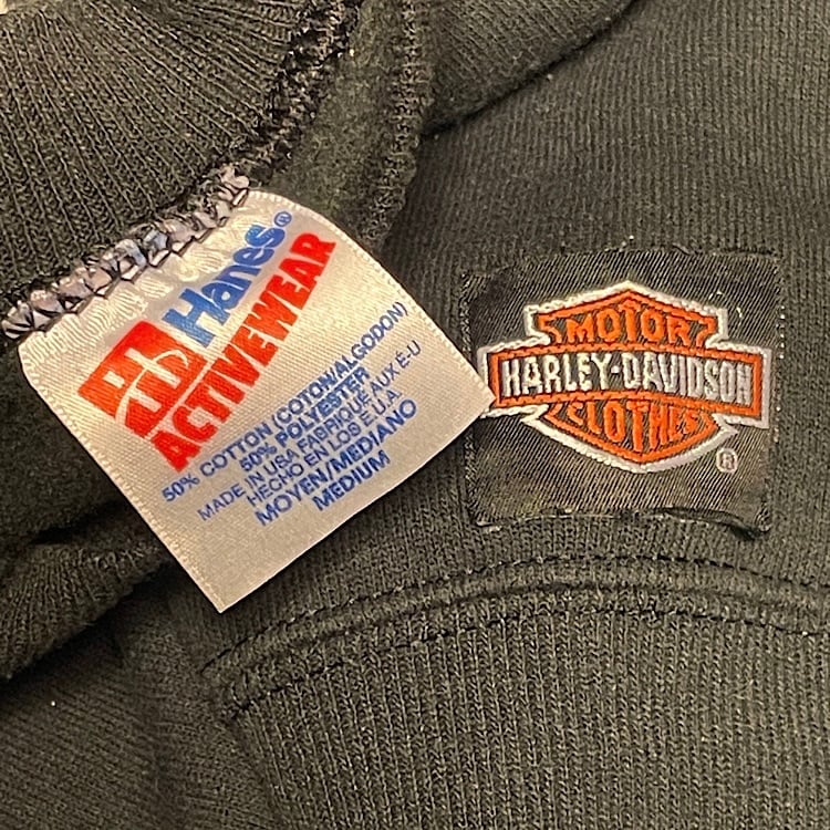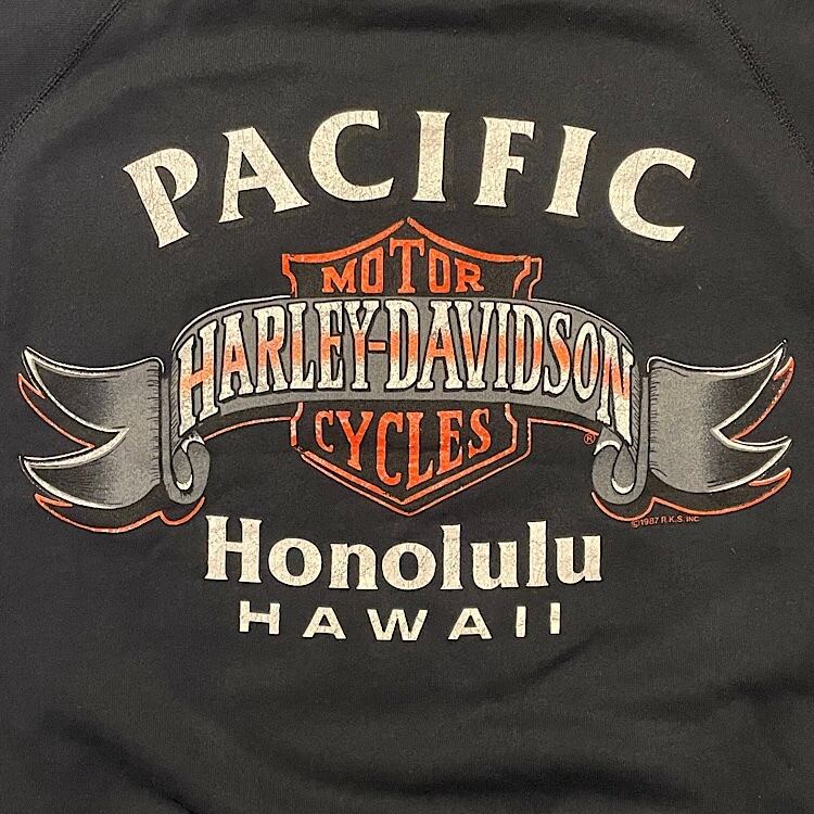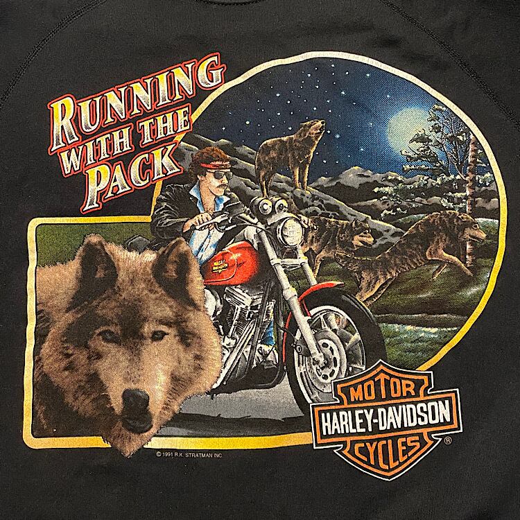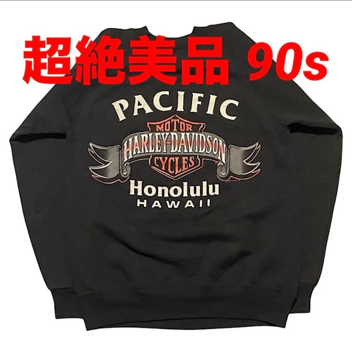 超絶美品 肉厚ミントコンディション 90s Hanes ハーレーダビッドソン ビンテージ スウェット 両面プリント USA製 フロント©️1991 バック©️1987 ラグランスリーブ(黒,Mサイズ)