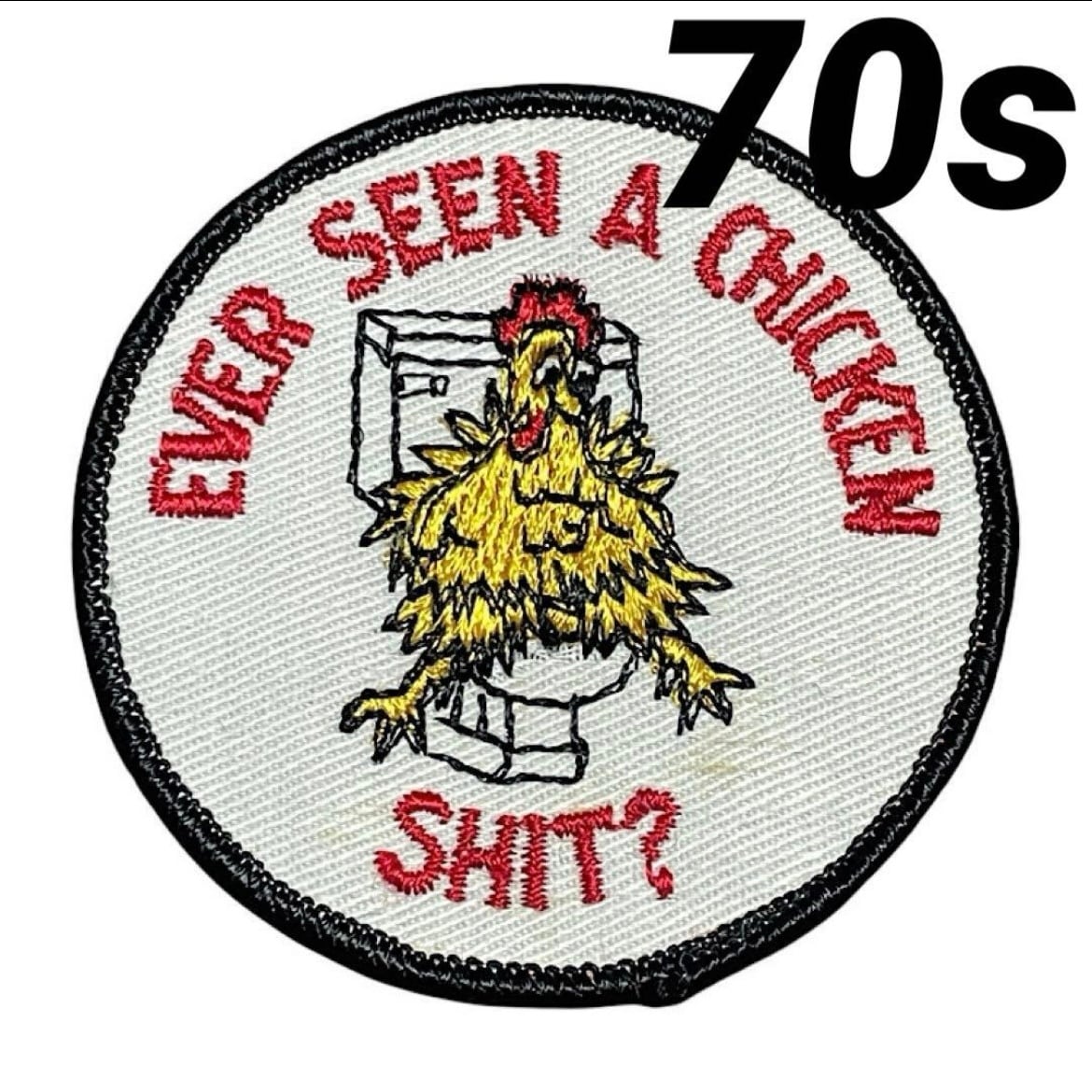 70s エロエロワッペン ビンテージ スラング EVER SEEN A CHICKEN SHIT? 当時物本物 ヒッピー ヴィンテージパッチ デッドストック DEAD STOCK チキン(チ○チ○の意)がこんなとこに座ってるの見たことあるかい?