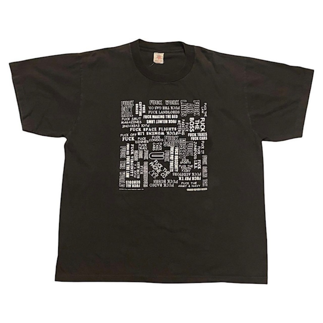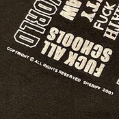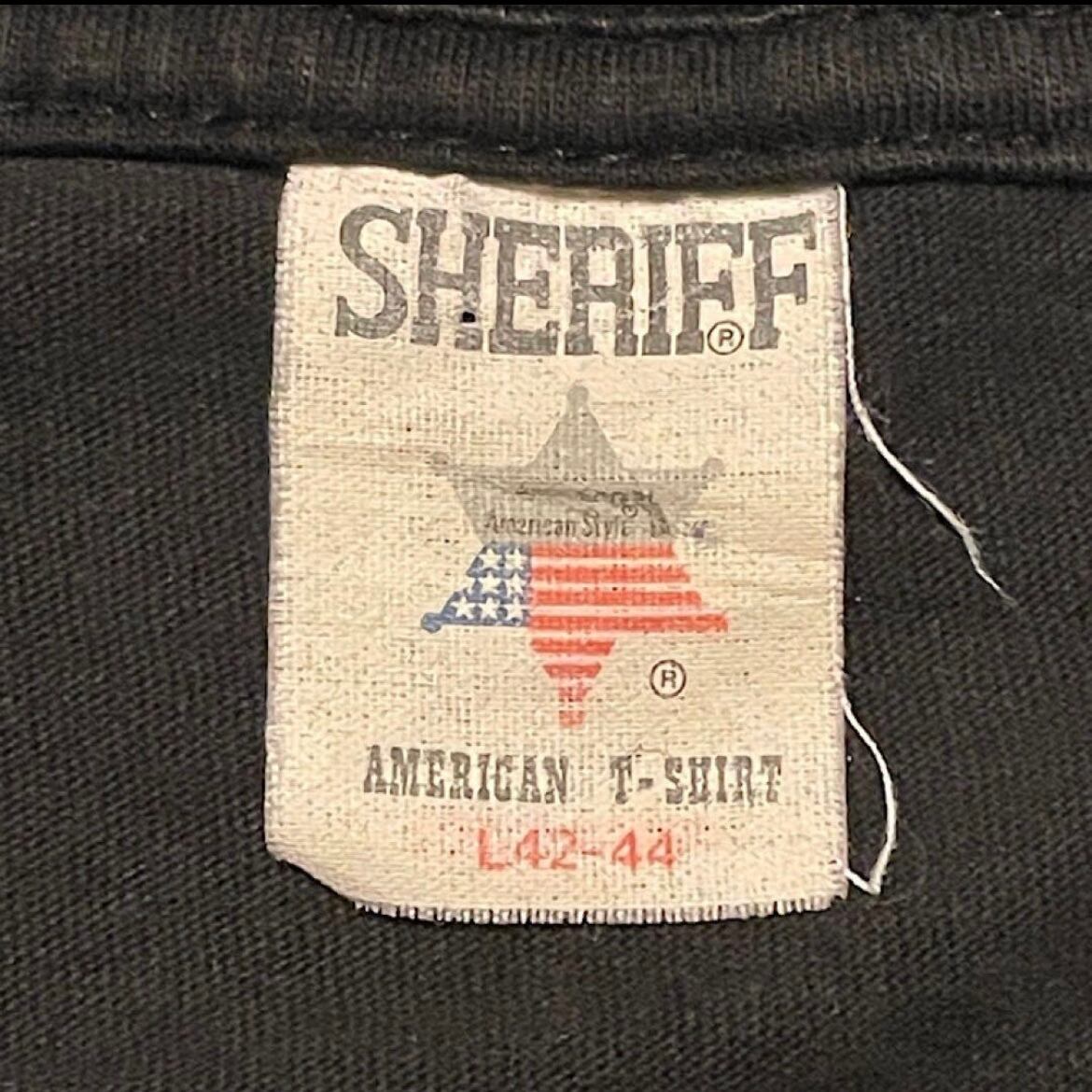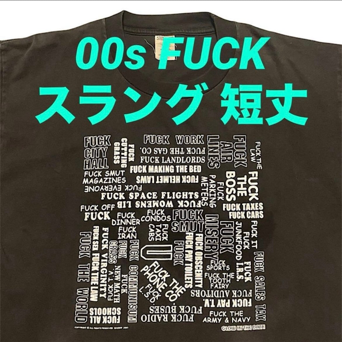 00s SHERIFF FUCK 蓄光プリント スラング ビンテージ Tシャツ ヘビーコットン 短丈ボックスシルエット(黒,Lサイズ)袖裾シングルステッチ