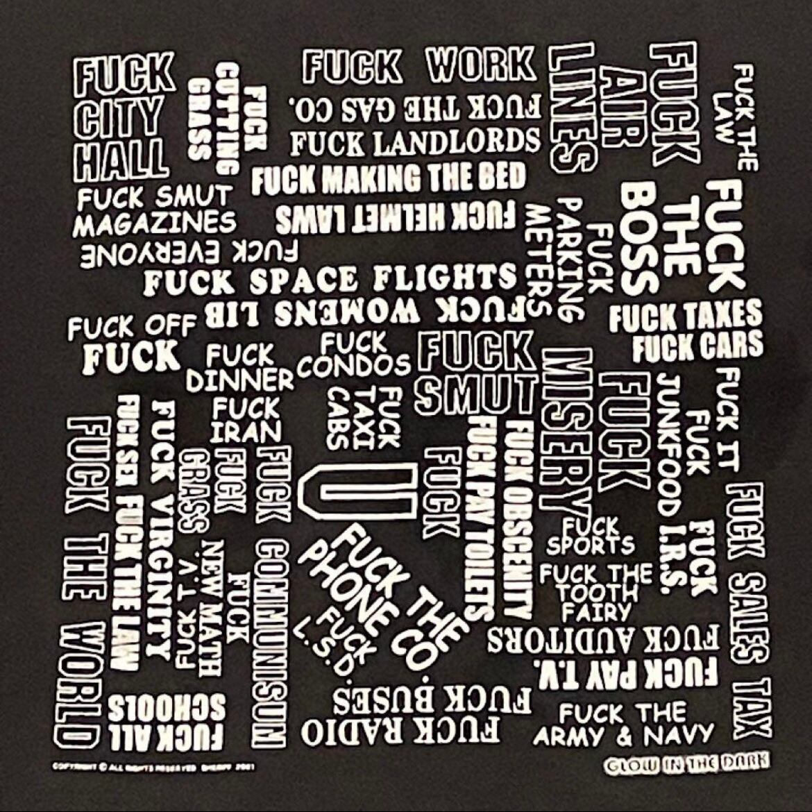 色んなFUCKを文字ったスラングが、これまた激レアな蓄光プリント(暗闇で光ります)されてます。