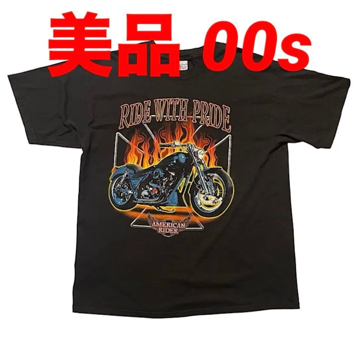 美品 00s Tシャツ ハーレーダビッドソン ビンテージ エヴォリューション ヘビーコットン AMERICAN RIDER GILDAN Ride With Pride アイアンクロス フレイム(黒,XLサイズ)袖裾ダブルステッチ