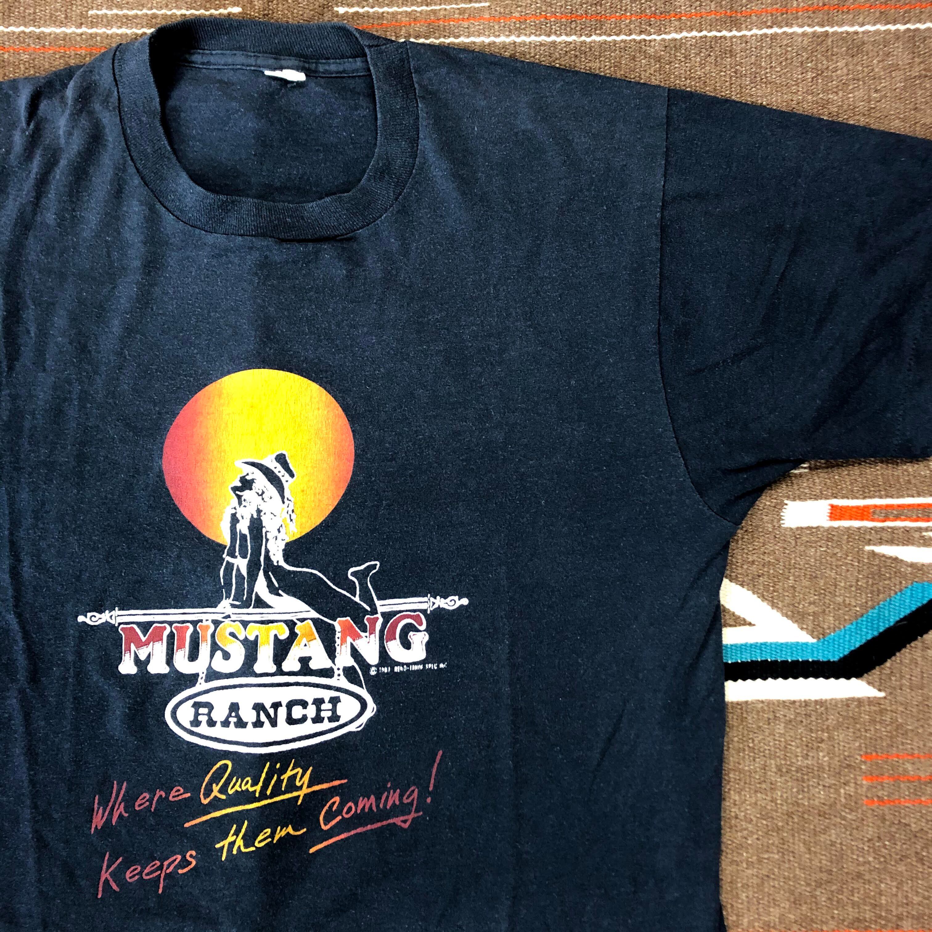 80年代 ビンテージ ムスタングランチ エロ ヌードレディ ストリッパー Tシャツ SCREEN STARS MUSTANG RANCH 1981(黒,L)