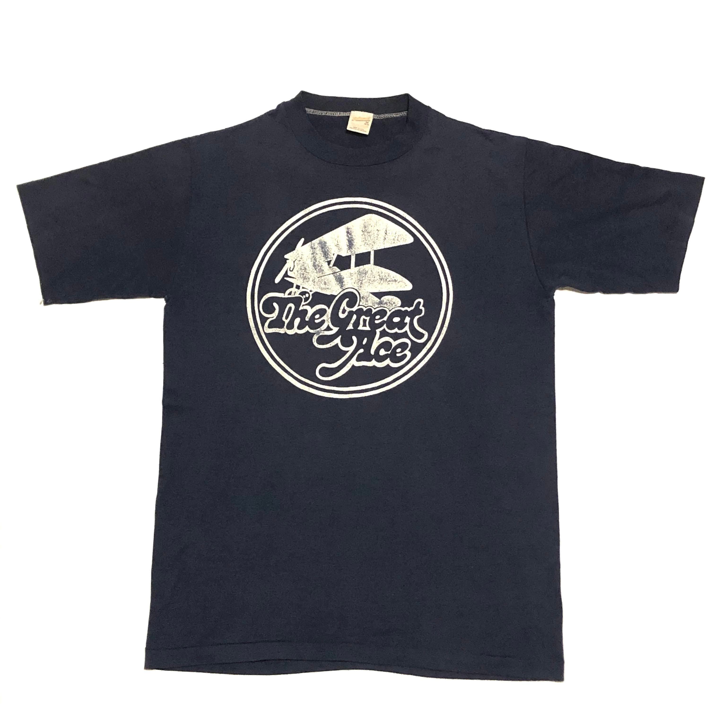 80s sportswear スポーツウェア ヴィンテージ 飛行機柄 Tシャツ 二葉機 The Great Ace(紺,M)