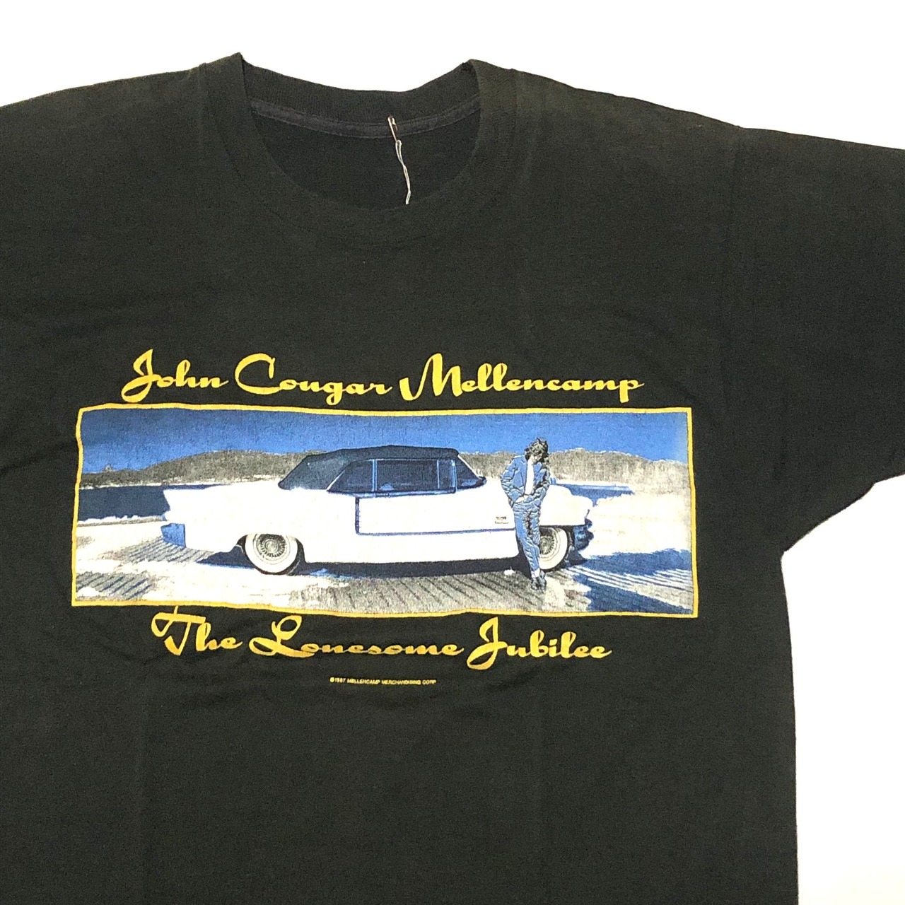 80s ヴィンテージ ジョンメレンキャンプ バンドT バンT ロックT john cougar mellencamp THE LONESOME JUBILEE アメリカングラフィティ クラシックカープリント Tシャツ ©1987(黒,L程度)