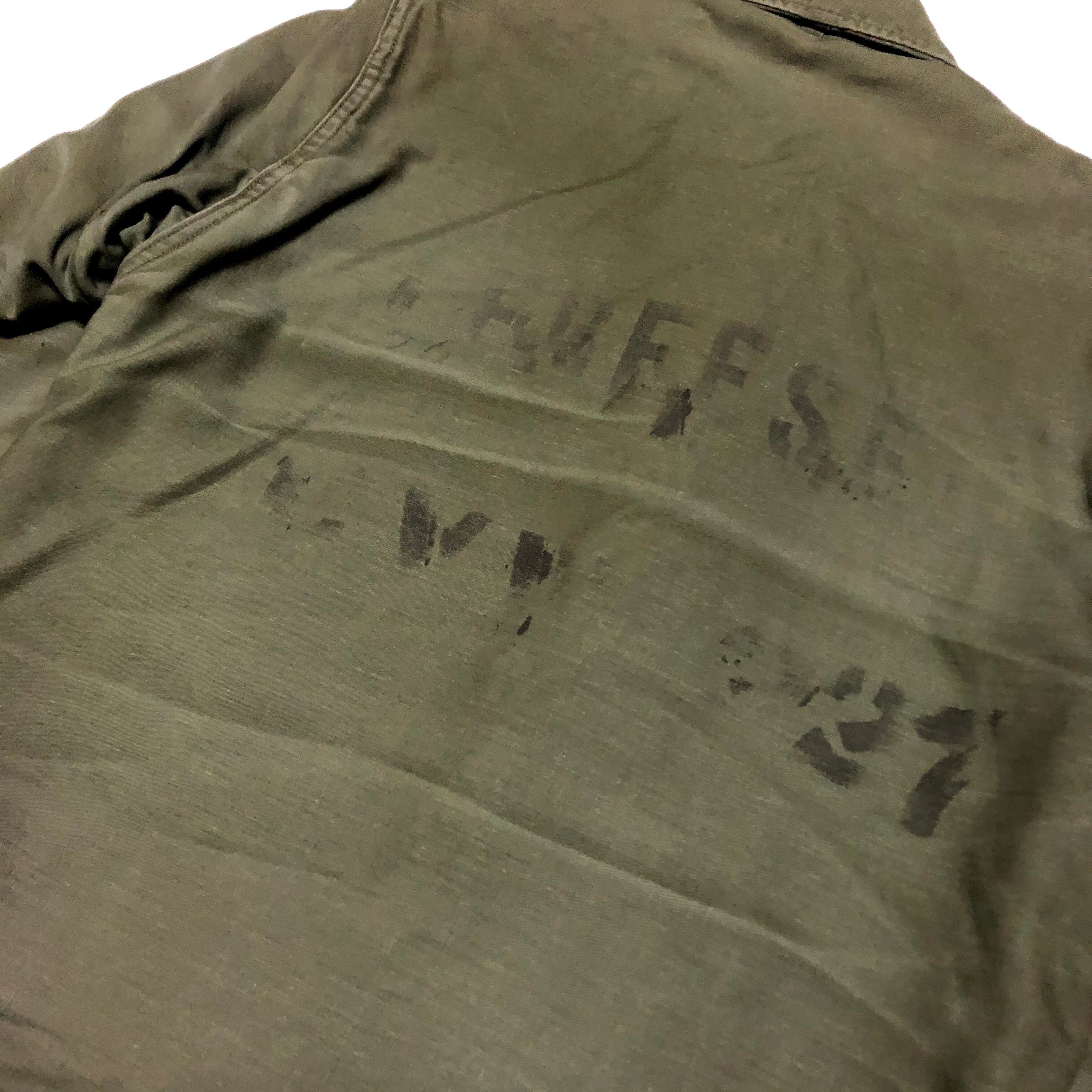 カーキのフェード感や生地の質感はヴィンテージならではで、胸ポケットの尖った三角フラップが特徴的な初期型のベル型コンマー搭載のA2デッキ。年式は読み取れませんが稀少な34サイズの一着です!