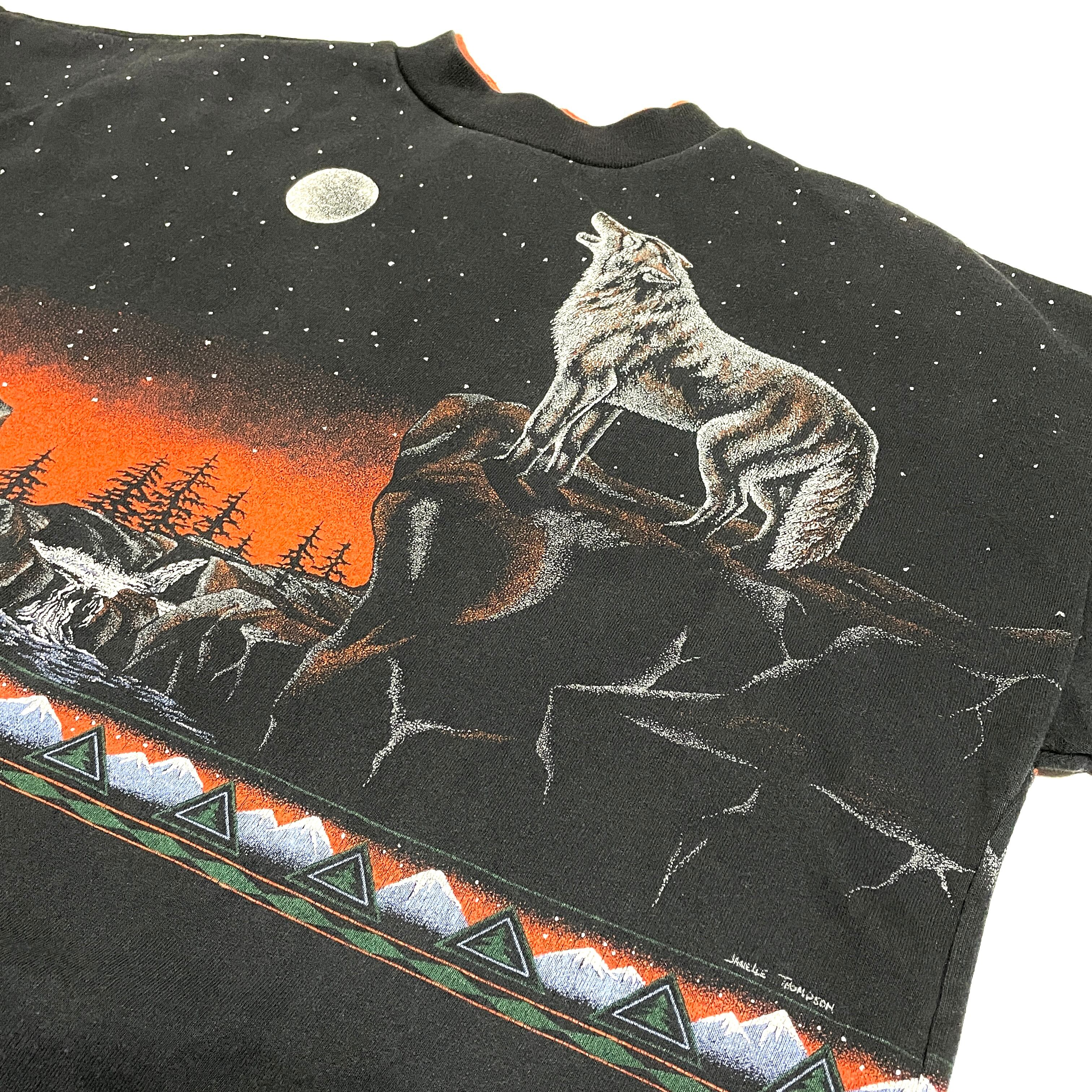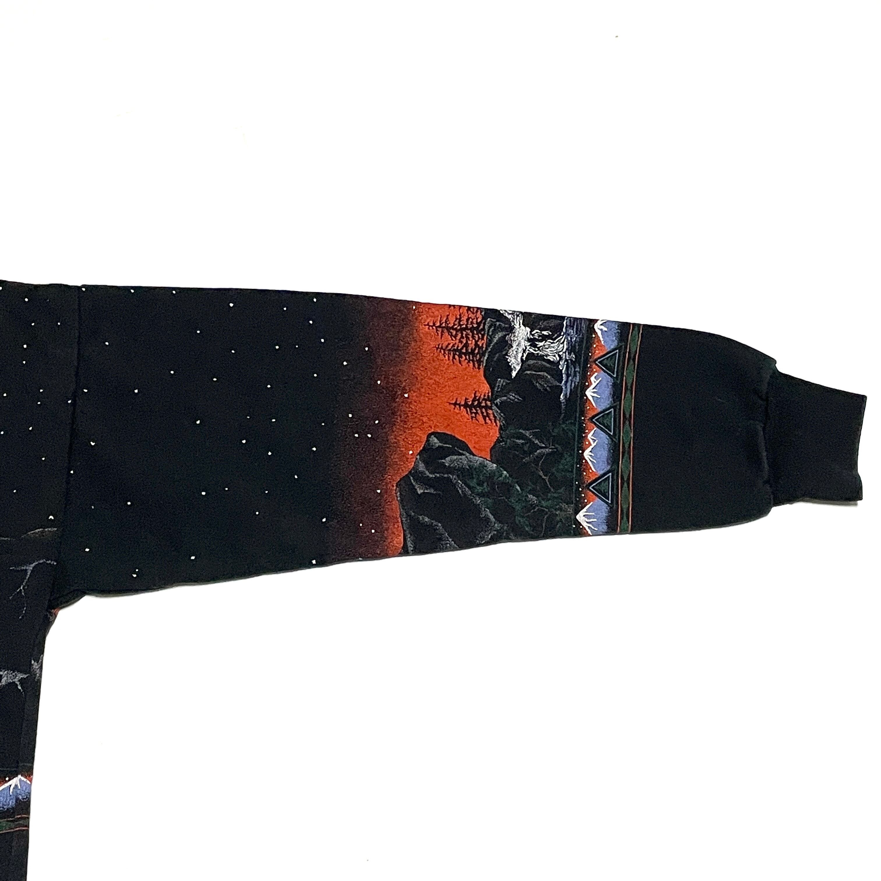 90s 名作 ヴィンテージ ウルフ 狼両面アニマルプリント スウェット ビッグサイズ 大判オーバープリント 袖プリ(黒,L-XL)