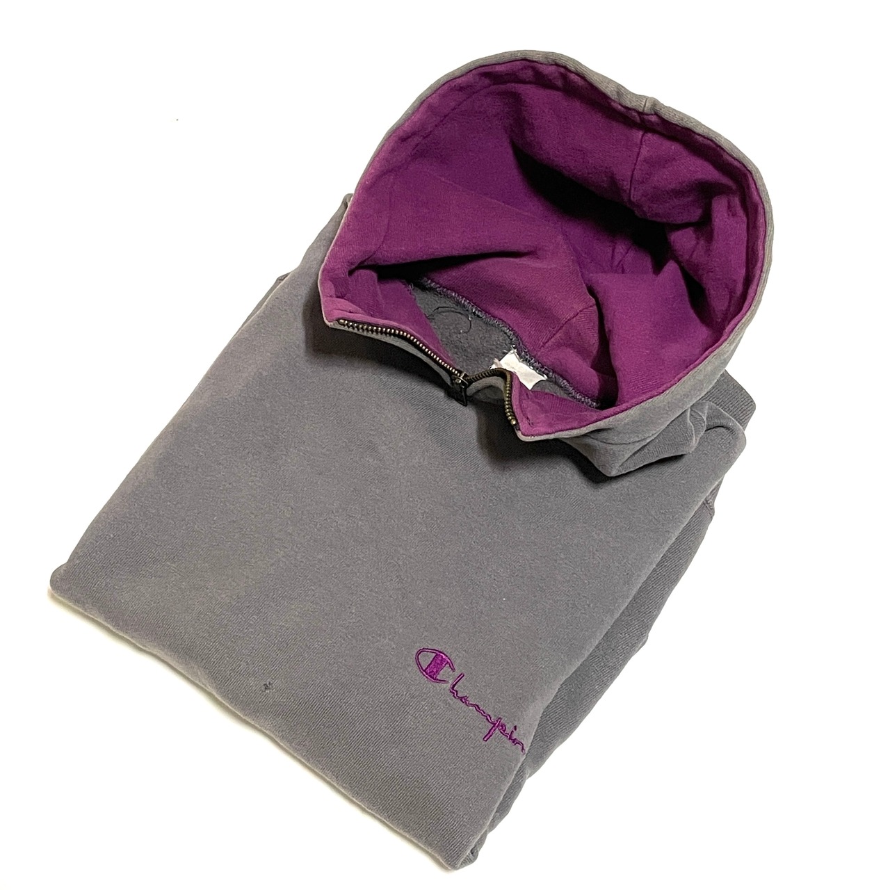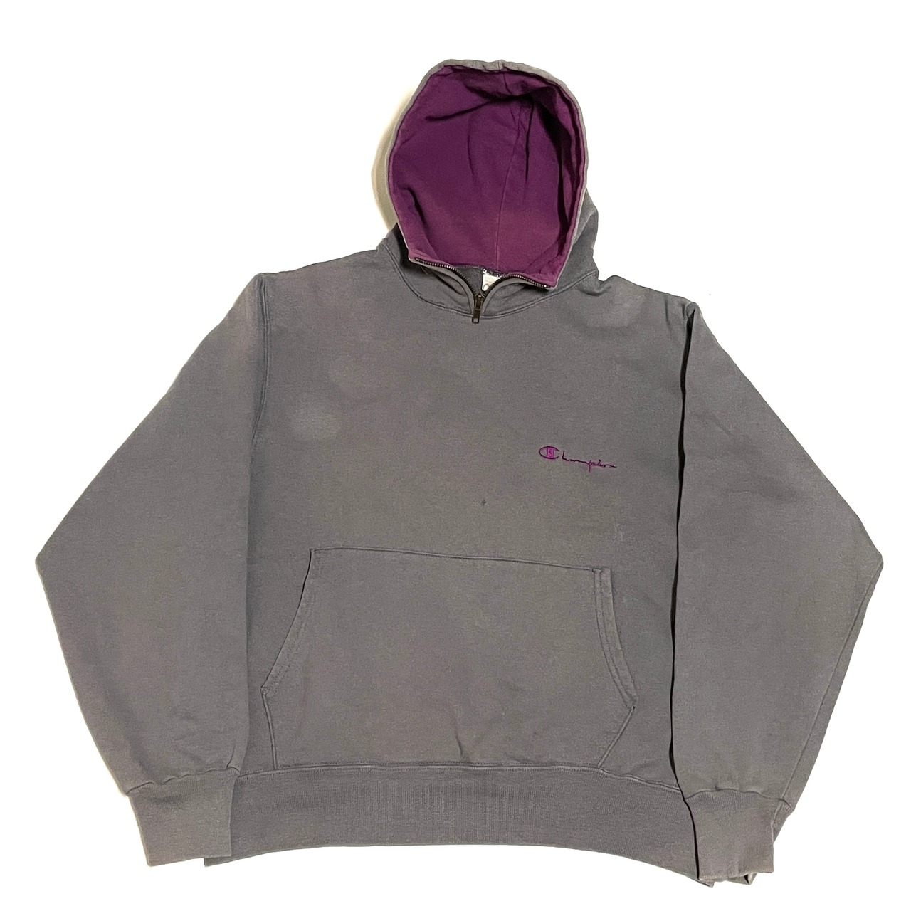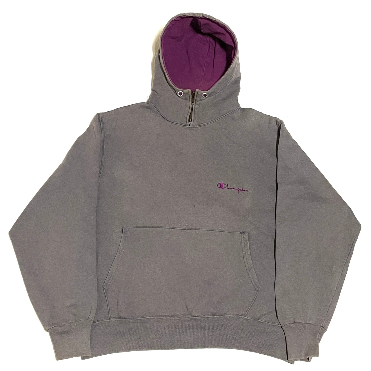 90s チャンピオン リバースウィーブ スウェットパーカー 激レア USA製 刺繍青タグ 珍ピオン ハーフジップパーカースタンドカラー 立ち襟 ストームジップ(グレー ×パープルツートンカラー,about L)