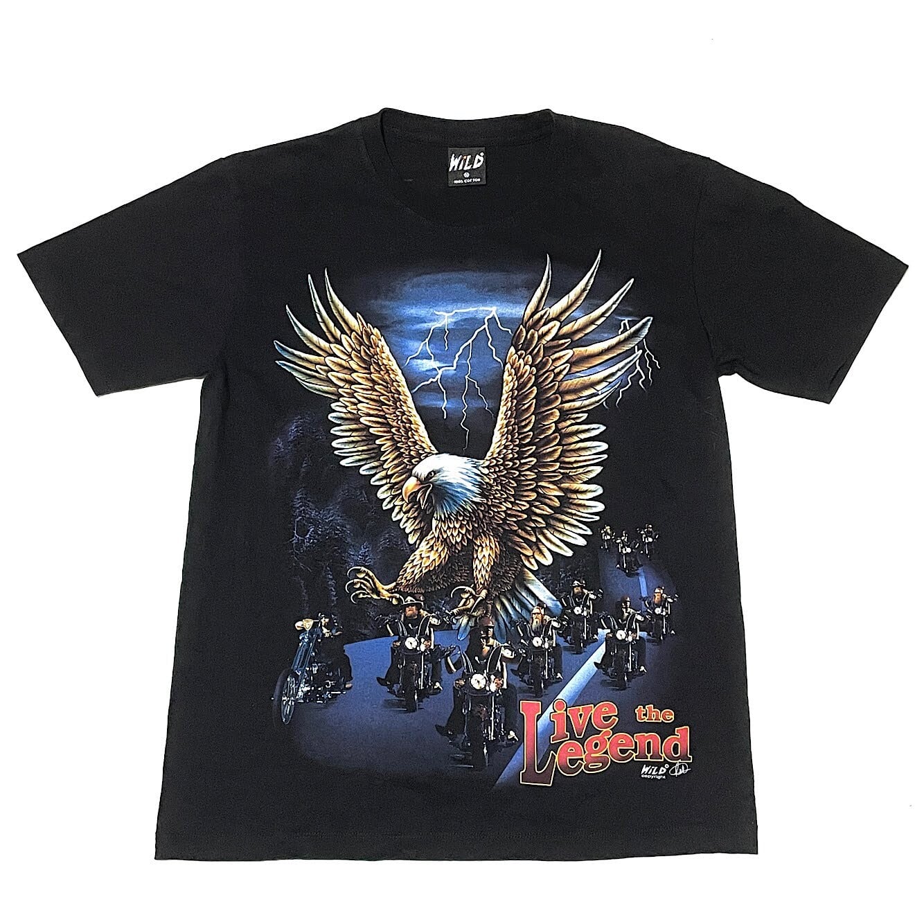 ヴィンテージ アメリカンサンダー ハーレーダビッドソン Tシャツ 雷イナズマ バイカー両面プリント WILD(黒,Mサイズ)ミントコンディション