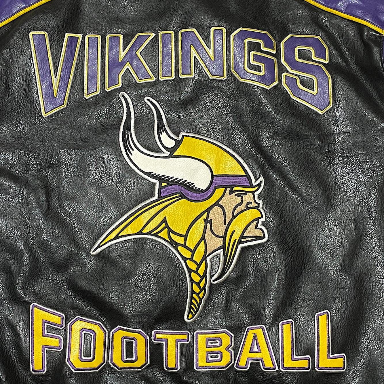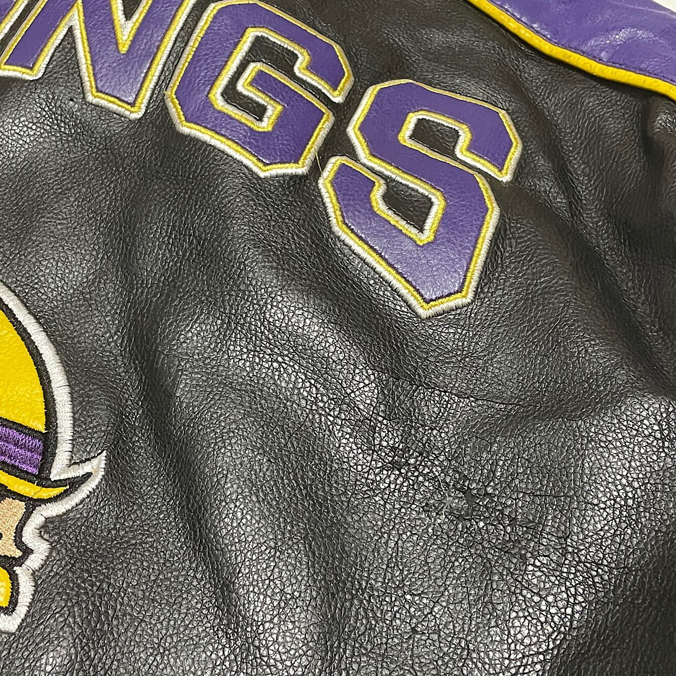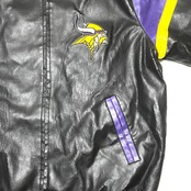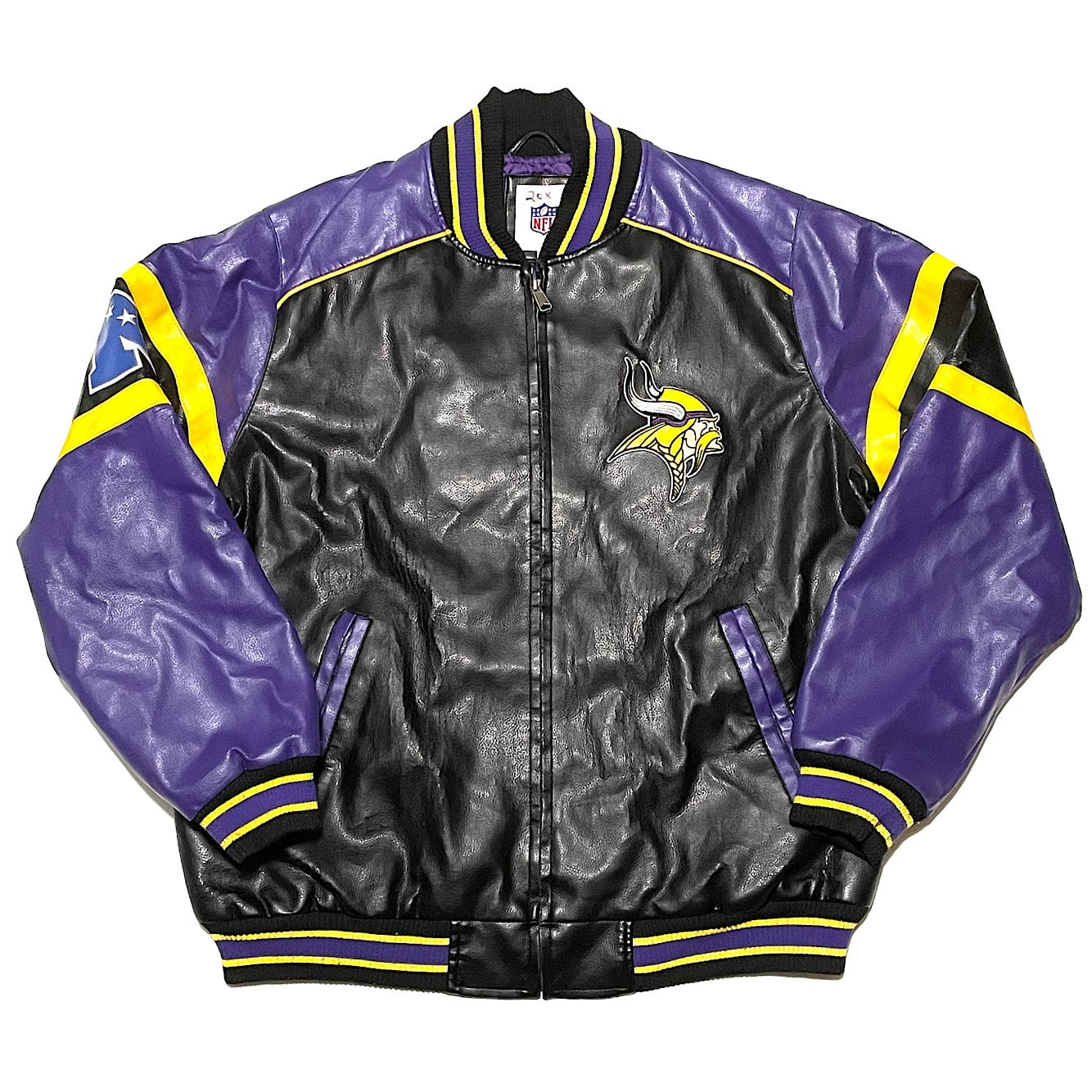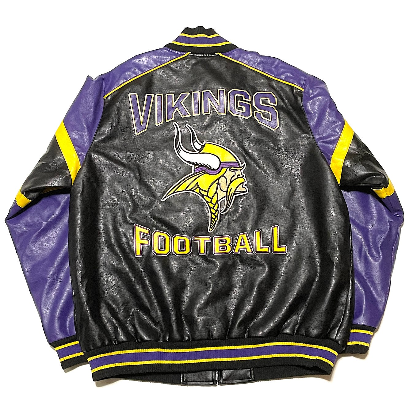 NFL アメフト VIKINGS レザースタジャン ビンテージ ミネソタバイキングス 合皮 フェイク ヴィンテージレザージャケット(L表記 XLサイズ程度)