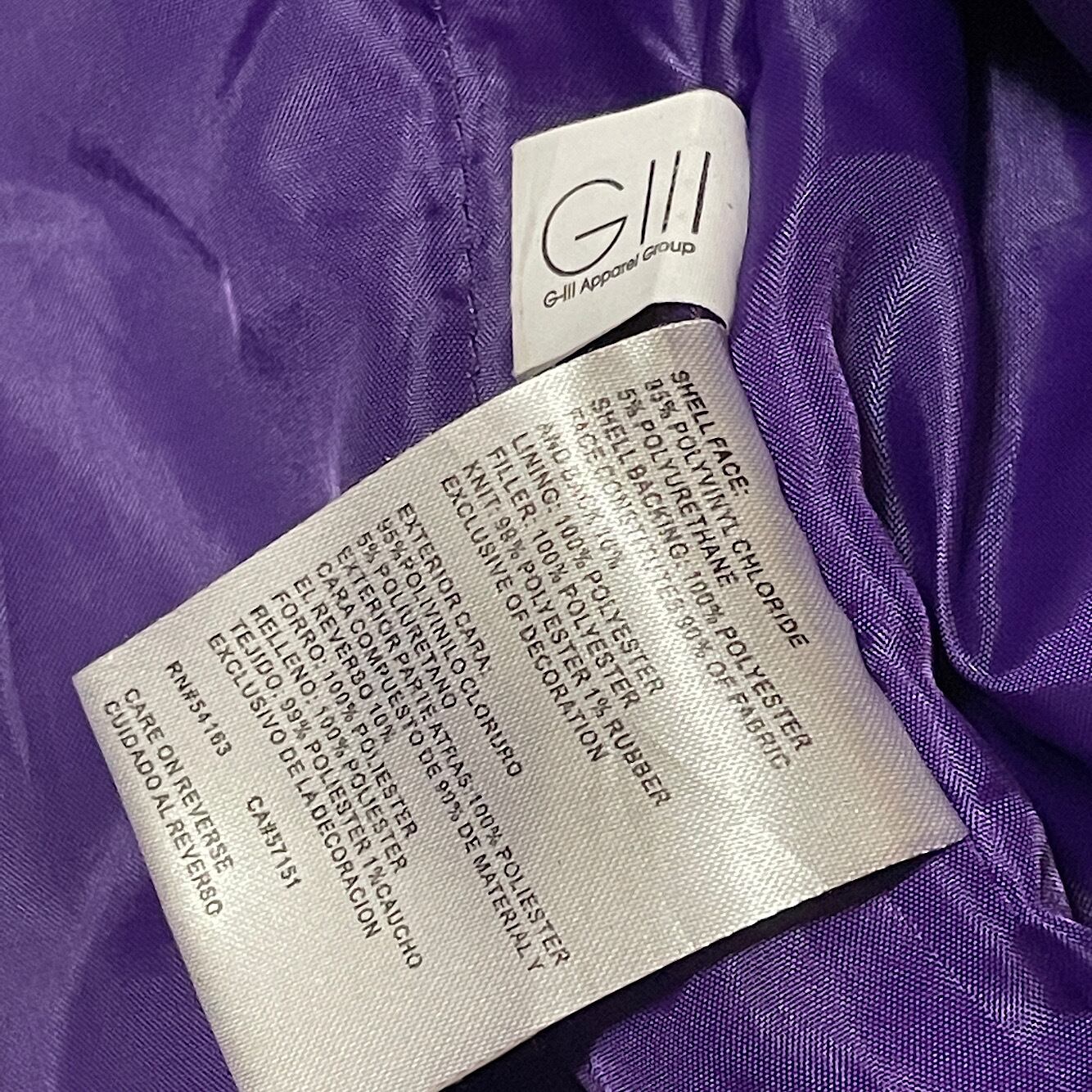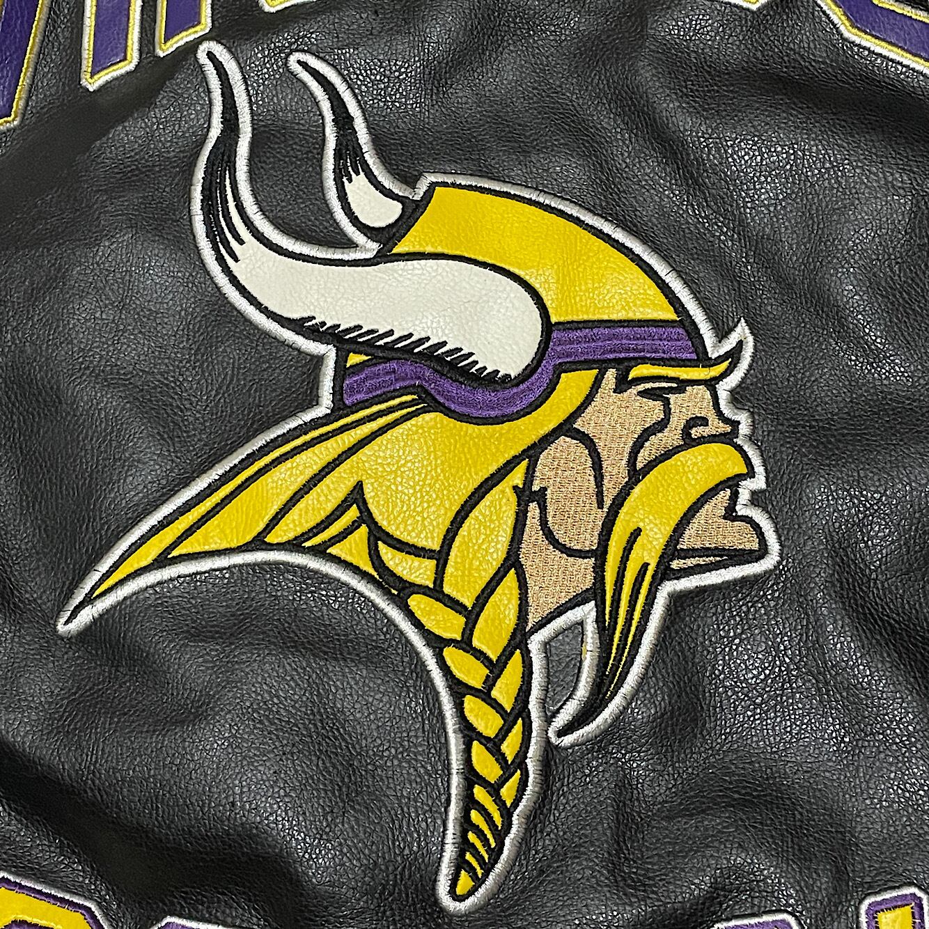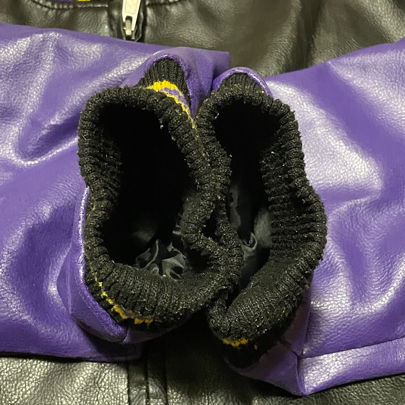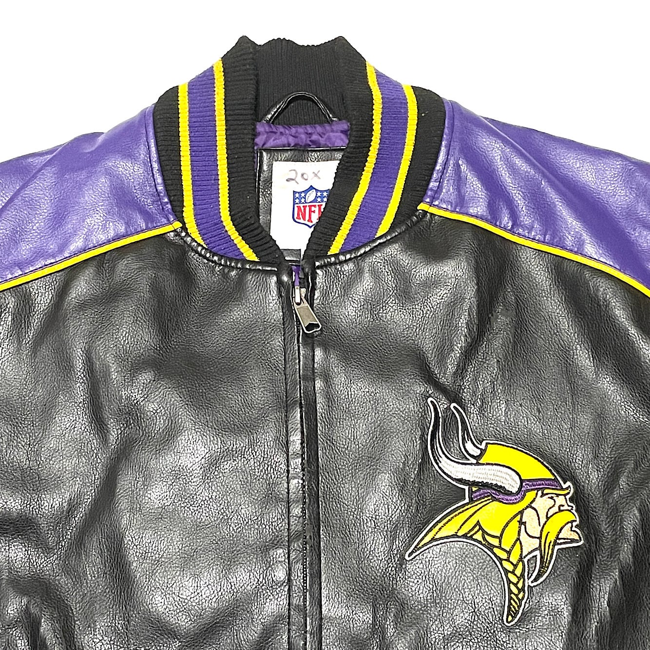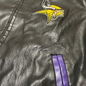 NFL アメフト VIKINGS レザースタジャン ビンテージ ミネソタバイキングス 合皮 フェイク ヴィンテージレザージャケット(L表記 XLサイズ程度)