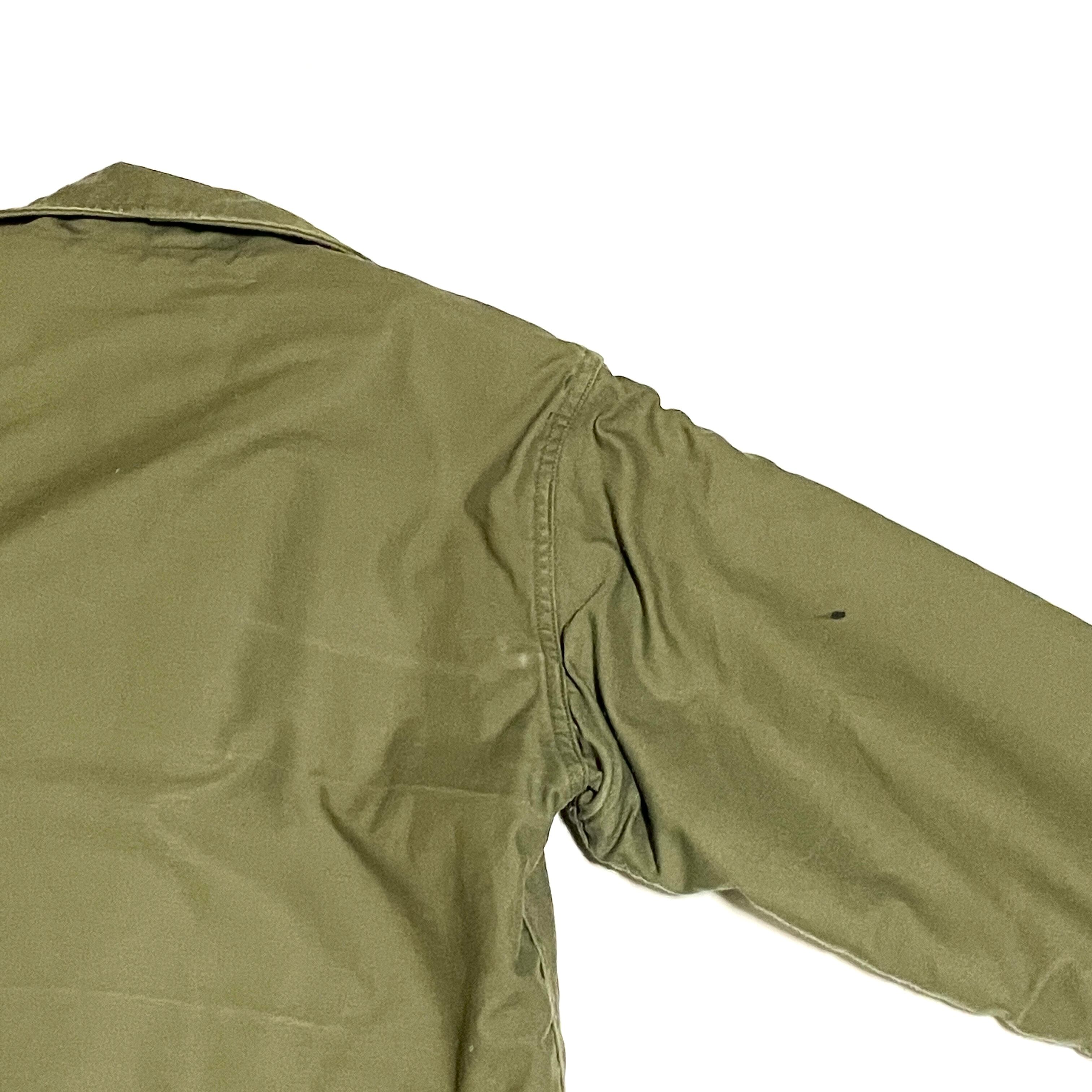 カーキのフェード感や生地の質感はヴィンテージならではで、胸ポケットの尖った三角フラップが特徴的な初期型のベル型コンマー搭載のA2デッキ。稀少な34サイズの一着です!