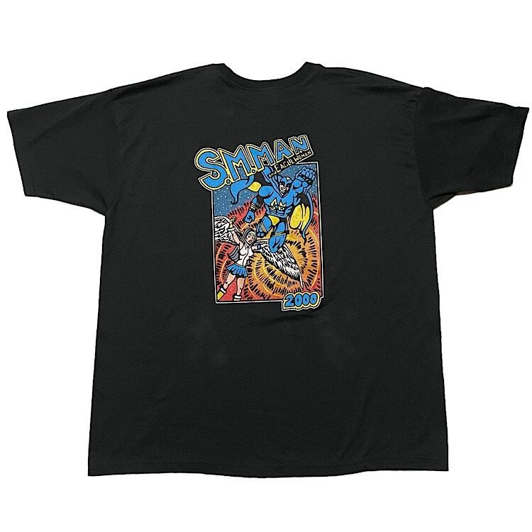 00s ビンテージ Tシャツ スーパーマンパロディー両面プリント FRUITS OF THE LOOM BEST 2000 アメコミ スラッシャーマガジン(黒,XXLサイズ)袖裾ダブルステッチ