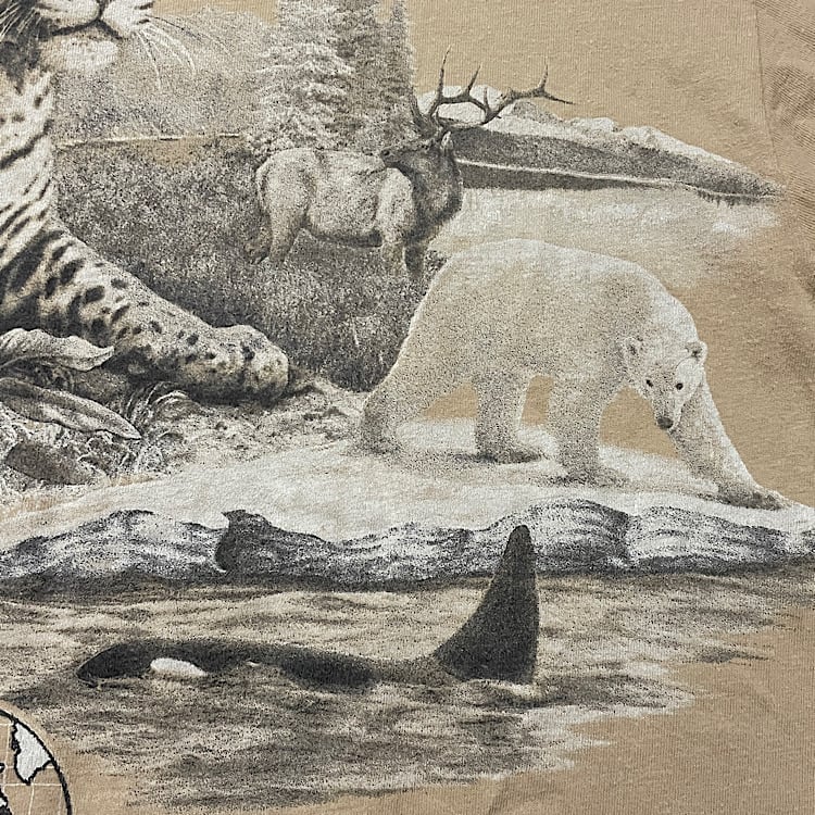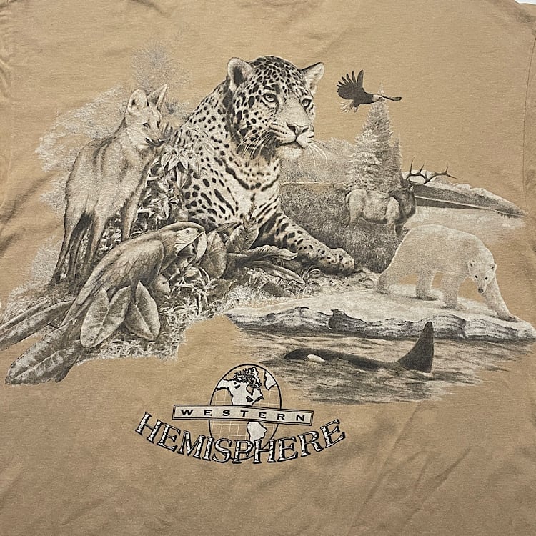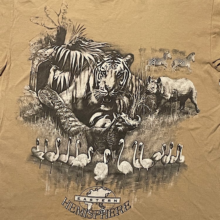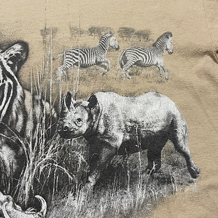 90s Hanes ビンテージ アニマルプリント Tシャツ 総柄両面プリント(茶系,Lサイズ)袖裾シングルステッチ LIQUID BLUE リキッドブルー BEEFY-T ビッグサイズ スペシャルプリント