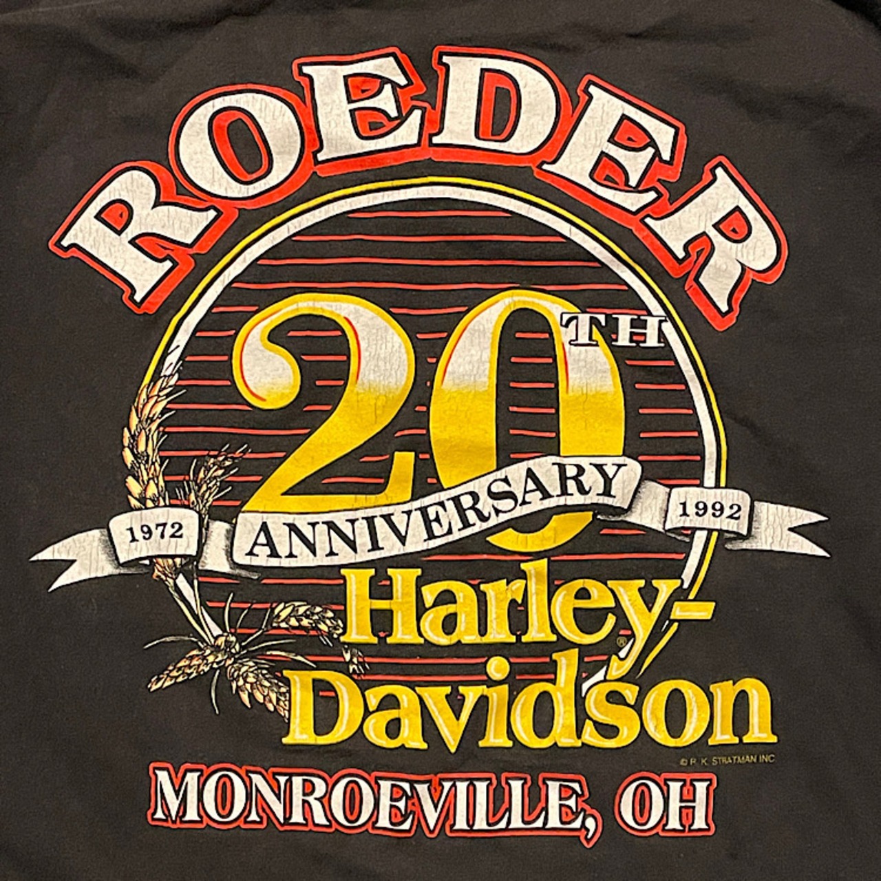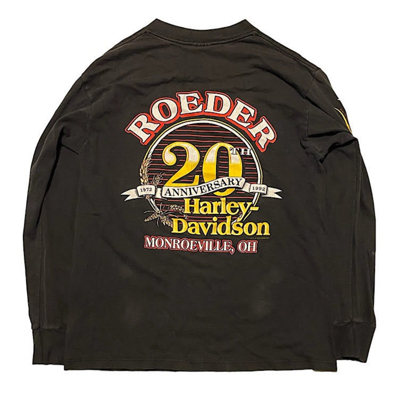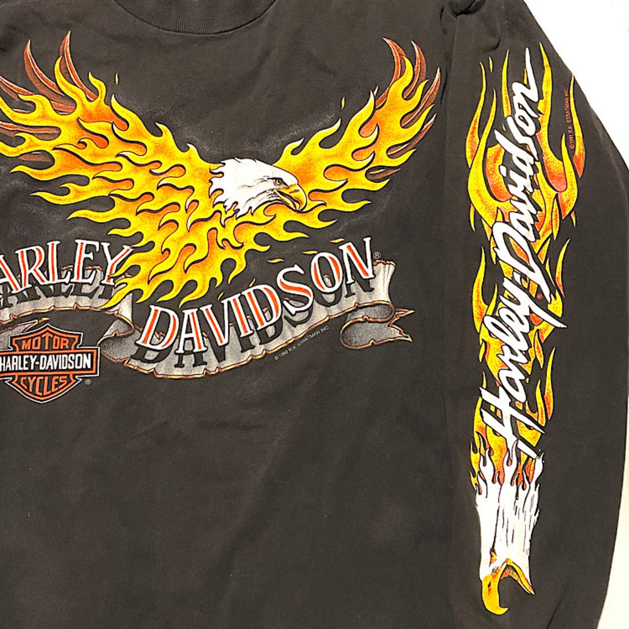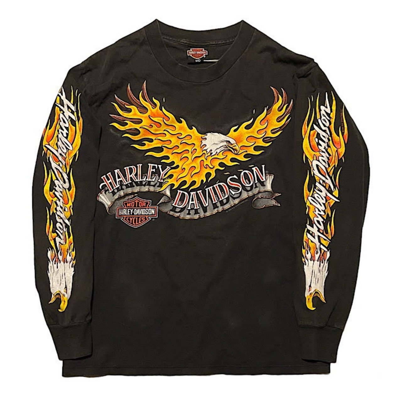 激レア 90s ハーレーダビッドソン ファイヤーパターン ビンテージ ロンT Tシャツ 両面プリント(黒,Mサイズ)