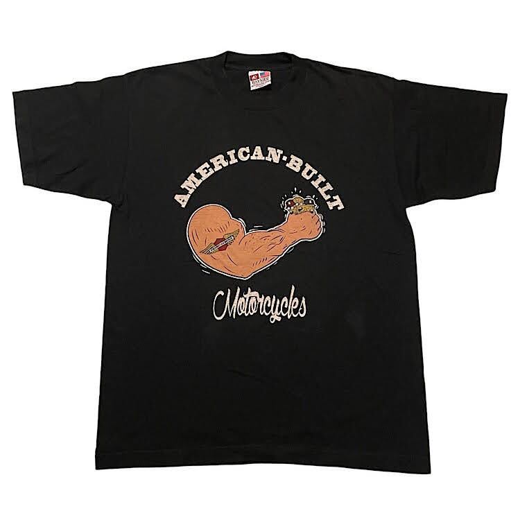 90s ビンテージ ハーレーダビッドソンパロディ Tシャツ ビッグアーム BAYSIDE BIG ARM Harley-Davidson(黒ブラック,Lサイズ)袖裾ダブルステッチ