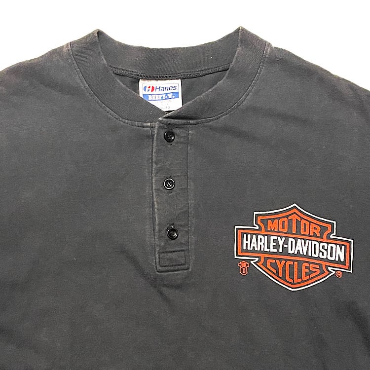 80s Hanes ビンテージ ハーレーダビッドソン Tシャツ サイドバルブエンジン1929DL ヒルクライム両面プリントデザイン ヘンリーネック USA製(黒,XLサイズ)