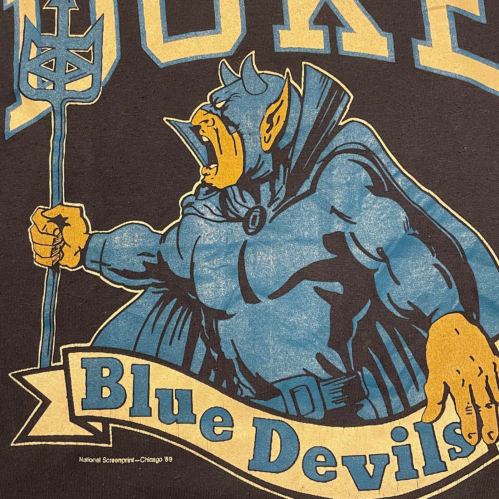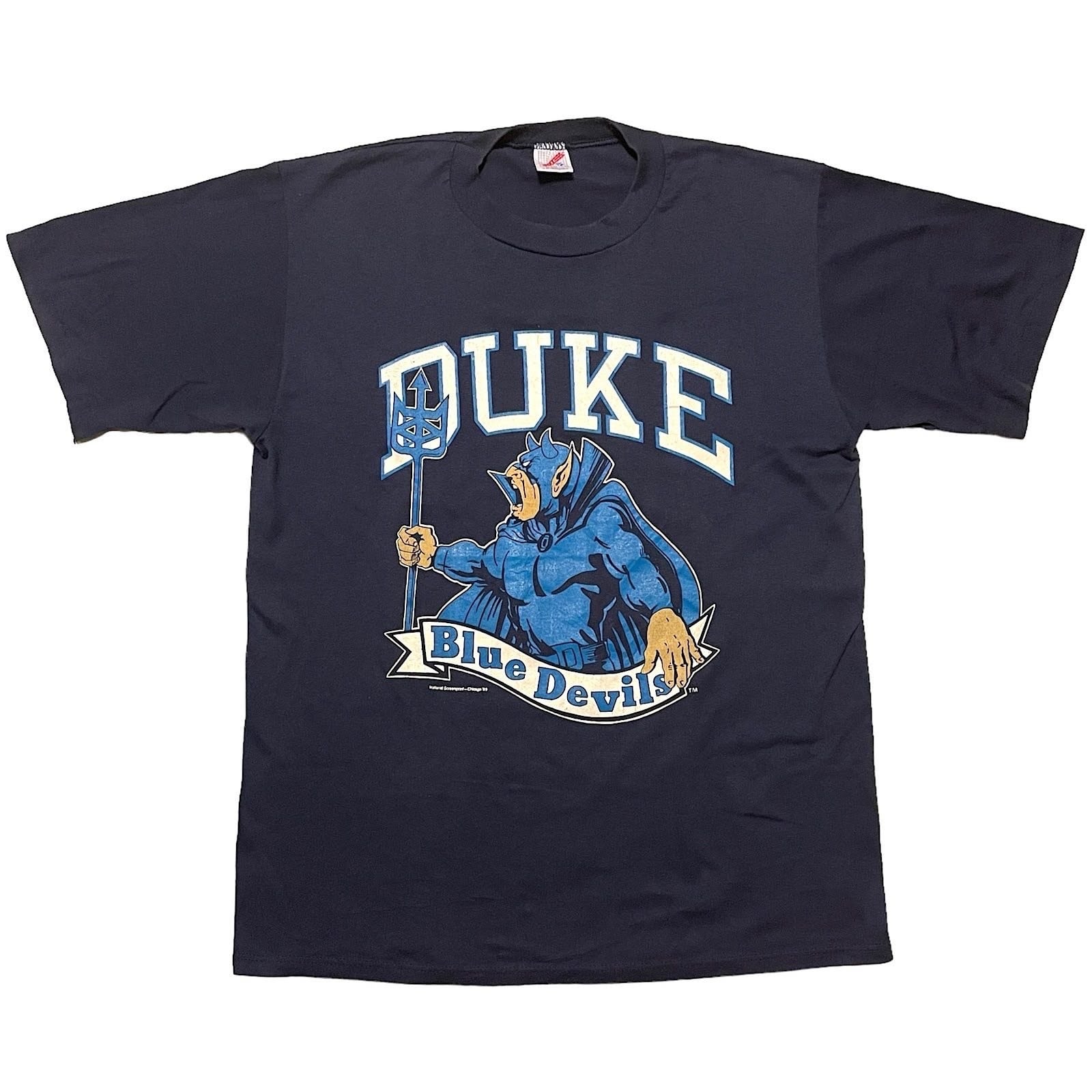 80s ビンテージ ブルーデビルズ Tシャツ デューク大学 カレッジプリント USA製 DUKE BLUE DEVILS 1989 JERZEES バスケットの名門校(ネイビー,XLサイズ)袖シングル裾ダブルステッチ