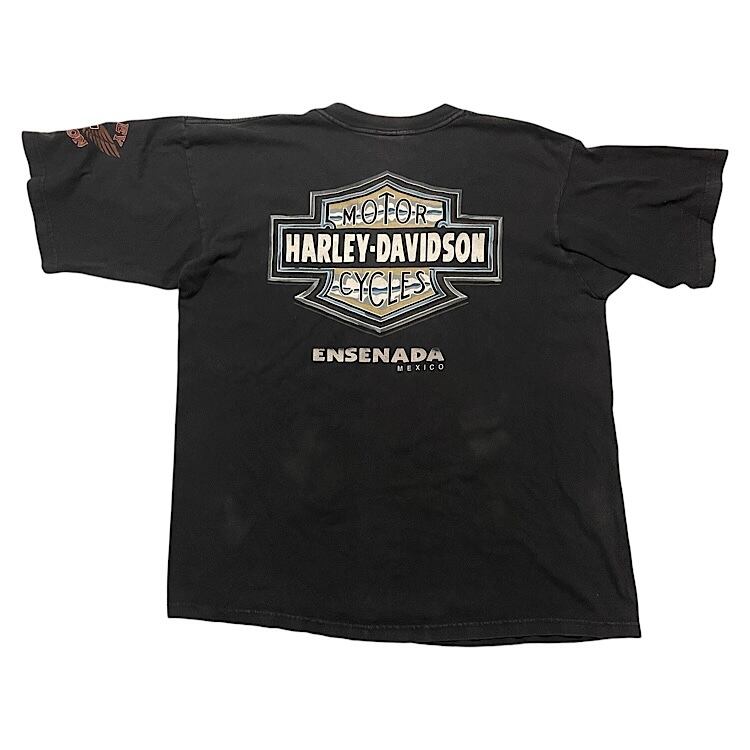 ハーレーダビッドソン ブルーフレイム ビンテージ Tシャツ ファイヤーパターン(黒,XLサイズ程度)袖裾ダブルステッチ